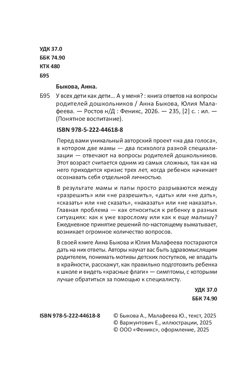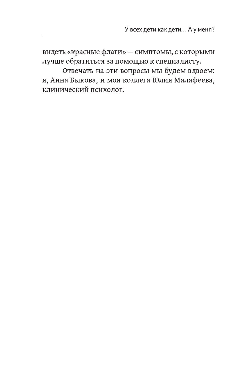 В своей книге Анна Быкова и Юлия Малафеева постараются дать на них ответы. Авторы научат вас быть здравомыслящим родителем, понимать мотивы детских поступков, не впадать в крайности, расскажут, как правильно подготовить ребенка к школе и видеть "красные флаги" – симптомы, с которыми лучше обратиться за помощью к специалисту.