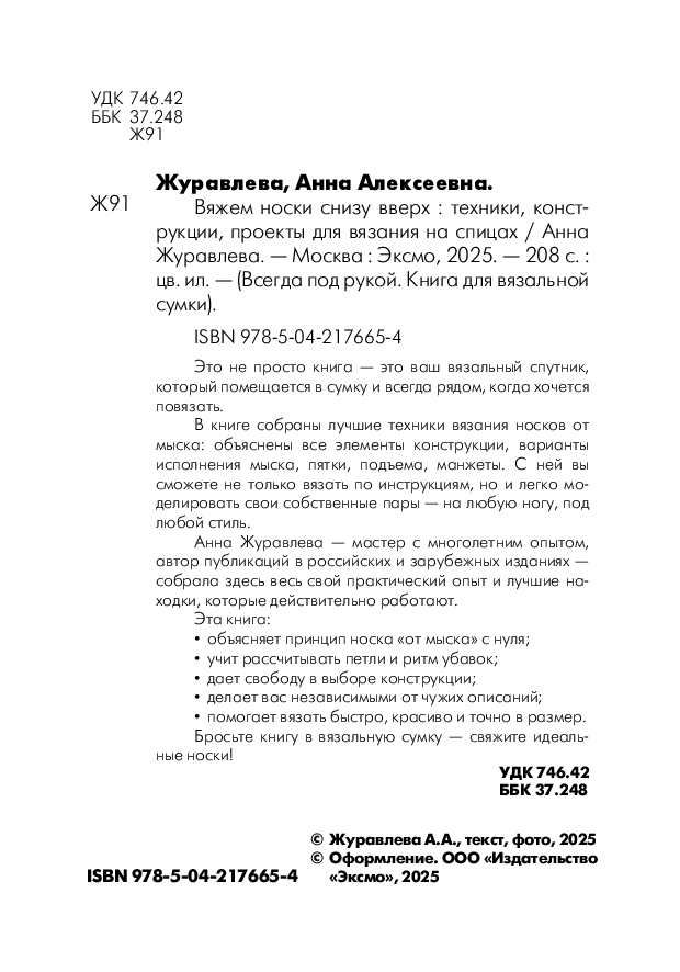 В книге собраны лучшие техники вязания носков от мыска: объяснены все элементы конструкции, варианты исполнения мыска, пятки, подъёма, манжеты. С ней вы сможете не только вязать по инструкциям, но и легко моделировать свои собственные пары – на любую ногу, под любой стиль.
