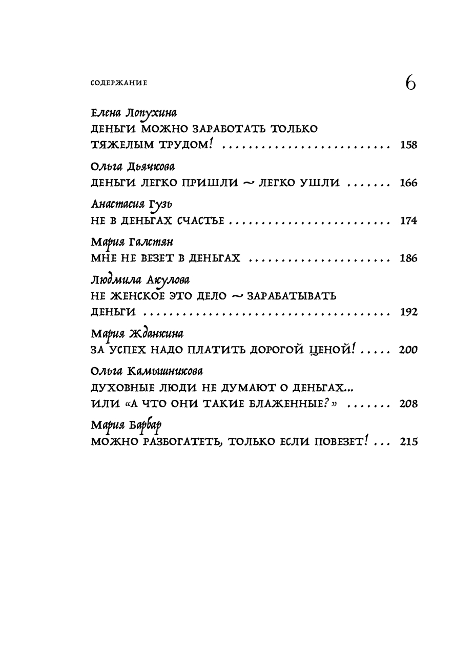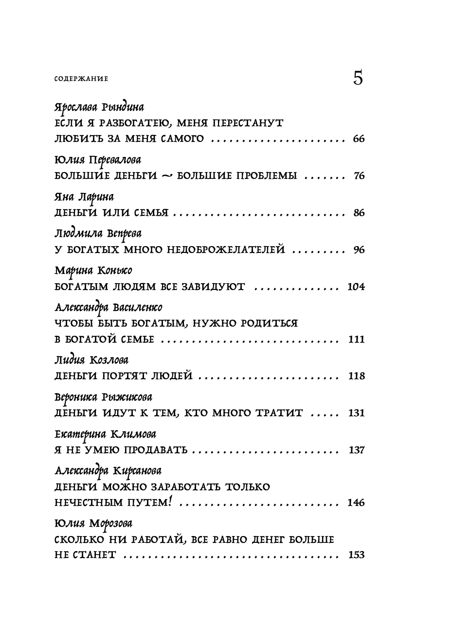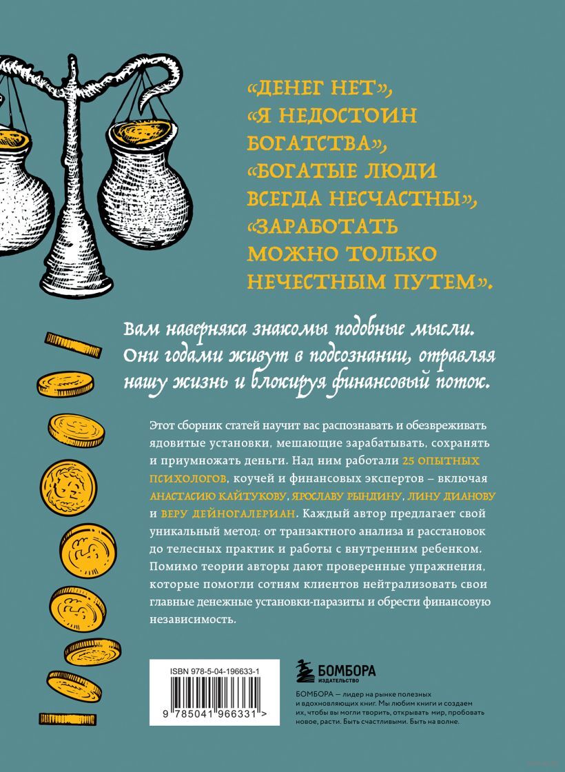 Этот сборник статей научит вас распознавать и обезвреживать ядовитые установки, мешающие зарабатывать, сохранять и приумножать деньги. Над ним работали 25 опытных психологов, коучей и финансовых экспертов – включая Анастасию Кайтукову, Ярославу Рындину, Лину Дианову и Веру Дейногалериан. Каждый автор предлагает свой уникальный метод: от транзактного анализа и расстановок до телесных практик и работы с внутренним ребенком. Помимо теории авторы дают проверенные упражнения, которые помогли сотням клиентов нейтрализовать свои главные денежные установки-паразиты и обрести финансовую независимость.