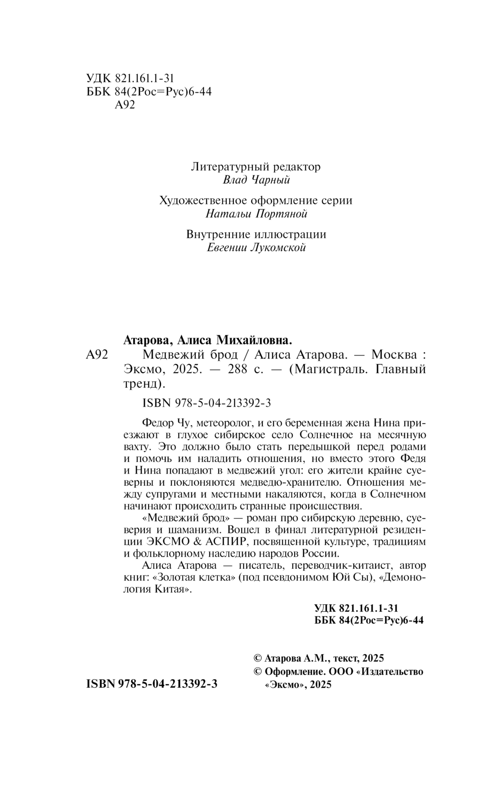"Медвежий брод" – роман про сибирскую деревню, суеверия и шаманизм. Вошел в финал литературной резиденции ЭКСМО & АСПИР, посвященной культуре, традициям и фольклорному наследию народов России.