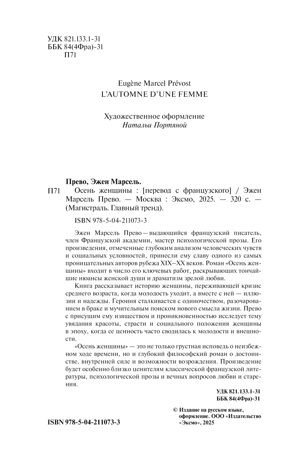 "Осень женщины" – это не только грустная исповедь о неизбежном ходе времени, но и глубокий философский роман о достоинстве, внутренней силе и возможности возрождения. Произведение будет особенно близко ценителям классической французской литературы, психологической прозы и вечных вопросов любви и старения.