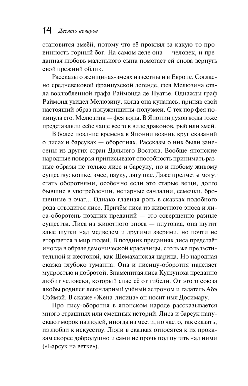 Собрание японских сказок, повествований о различных чудесах, добрых и страшных, смешных и грустных, лукавых и назидательных, и всегда поражающих своей оригинальностью и эмоциональной глубиной. В ней читатель, большой и маленький, познакомится с проказливыми лешими – тэнгу и водяными каппа, прекрасными девами-птицами и женщинами-змеями, коварными оборотнями лисами и барсуками, весельчаком и балагуром Хикоити.