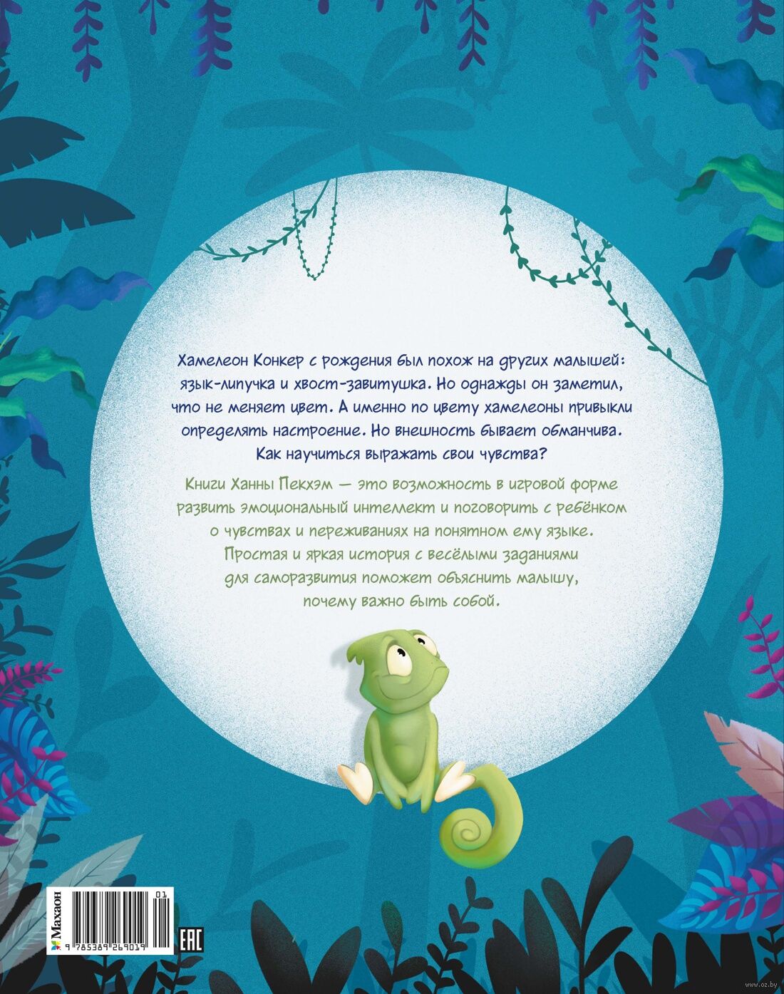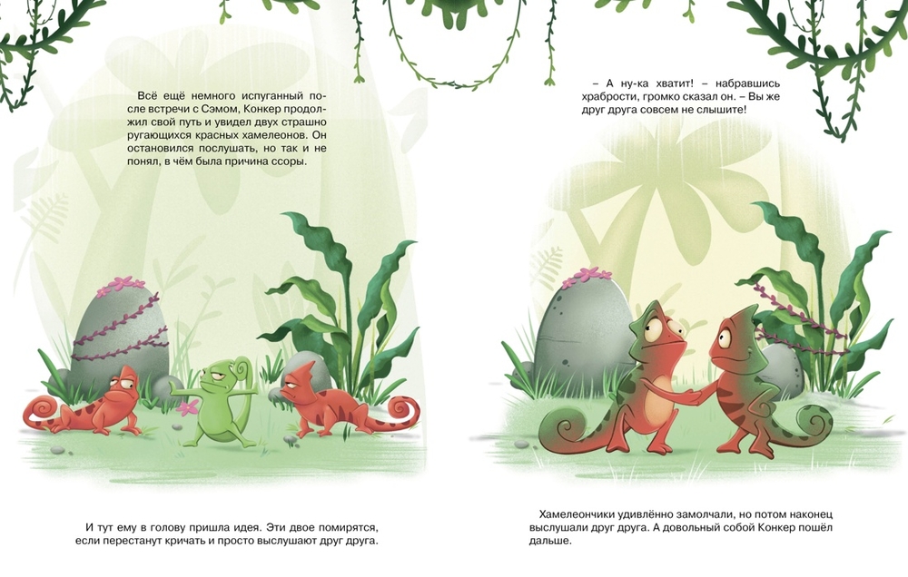 Хамелеон Конкер с рождения был похож на других малышей: язык-липучка и хвост-завитушка. Но однажды он заметил, что не меняет цвет. А именно по цвету хамелеоны привыкли определять настроение. Но внешность бывает обманчива. Как научиться выражать свои чувства?