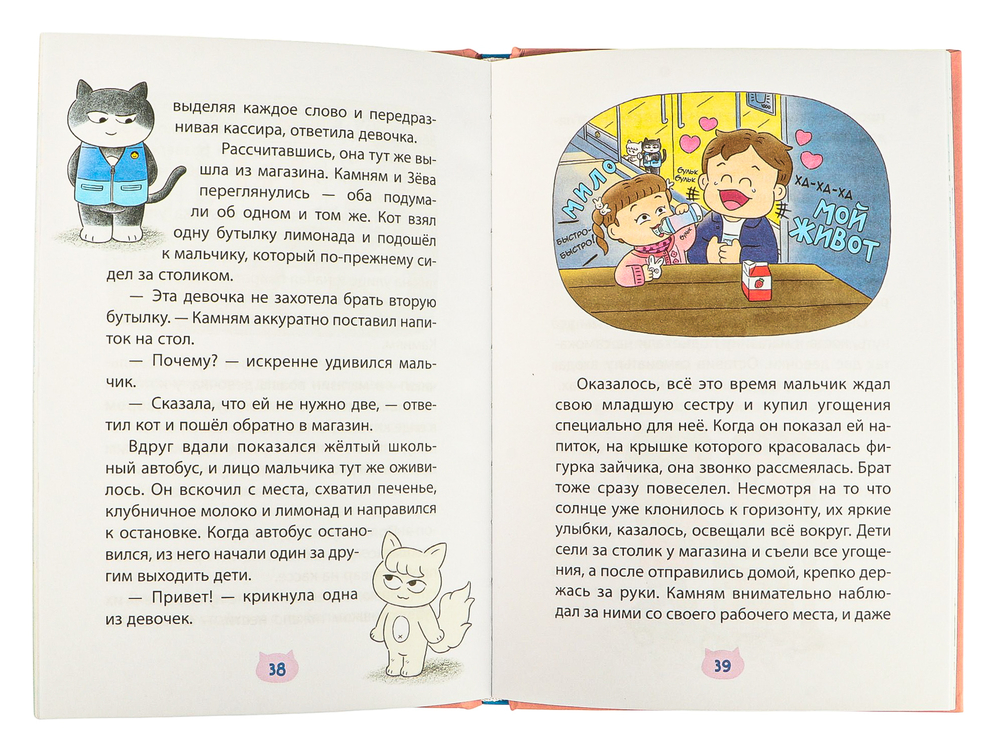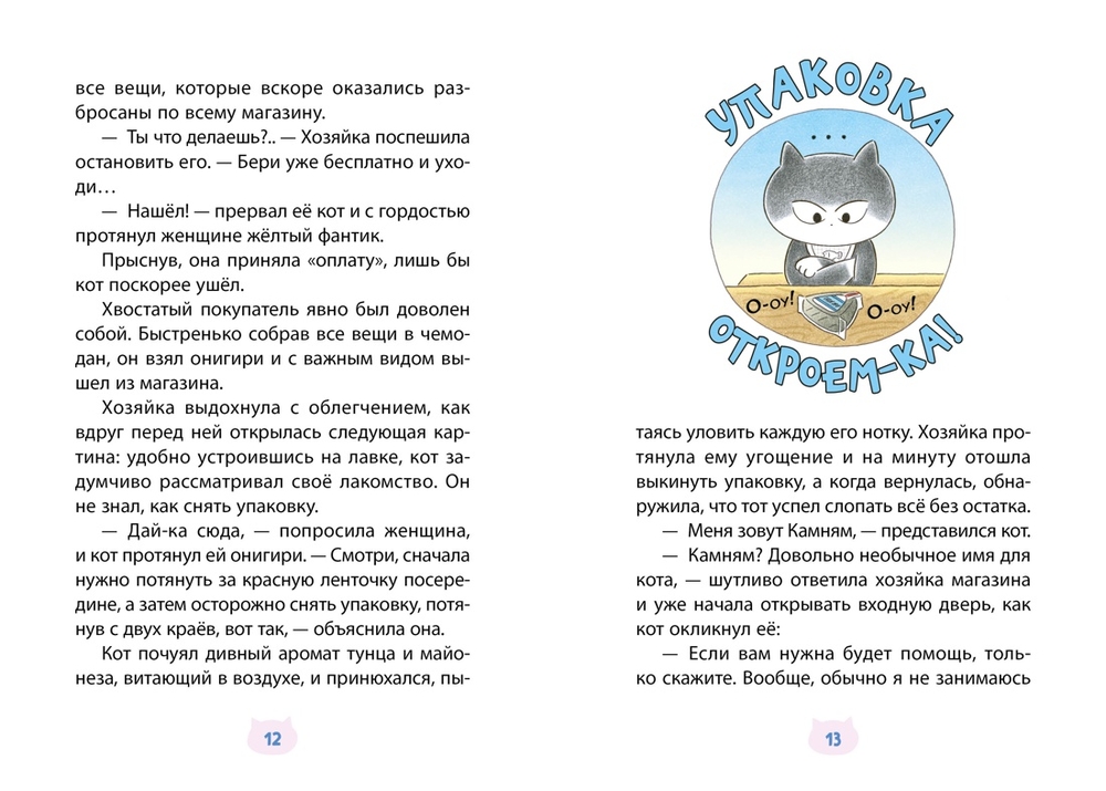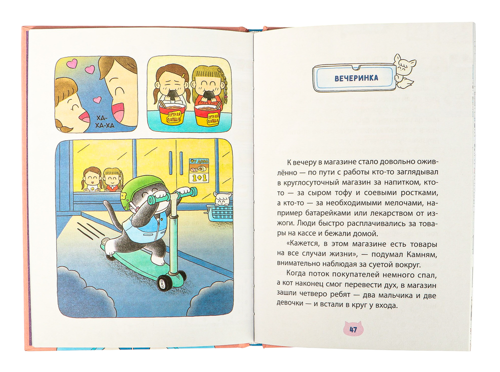 Путешествие Камняма продолжается! На этот раз находчивый кот пришёл поработать в самый уютный магазинчик на свете: здесь продаются вкусные печенья и тортики ко дню рождения, длинная лапша и шипучий лимонад.