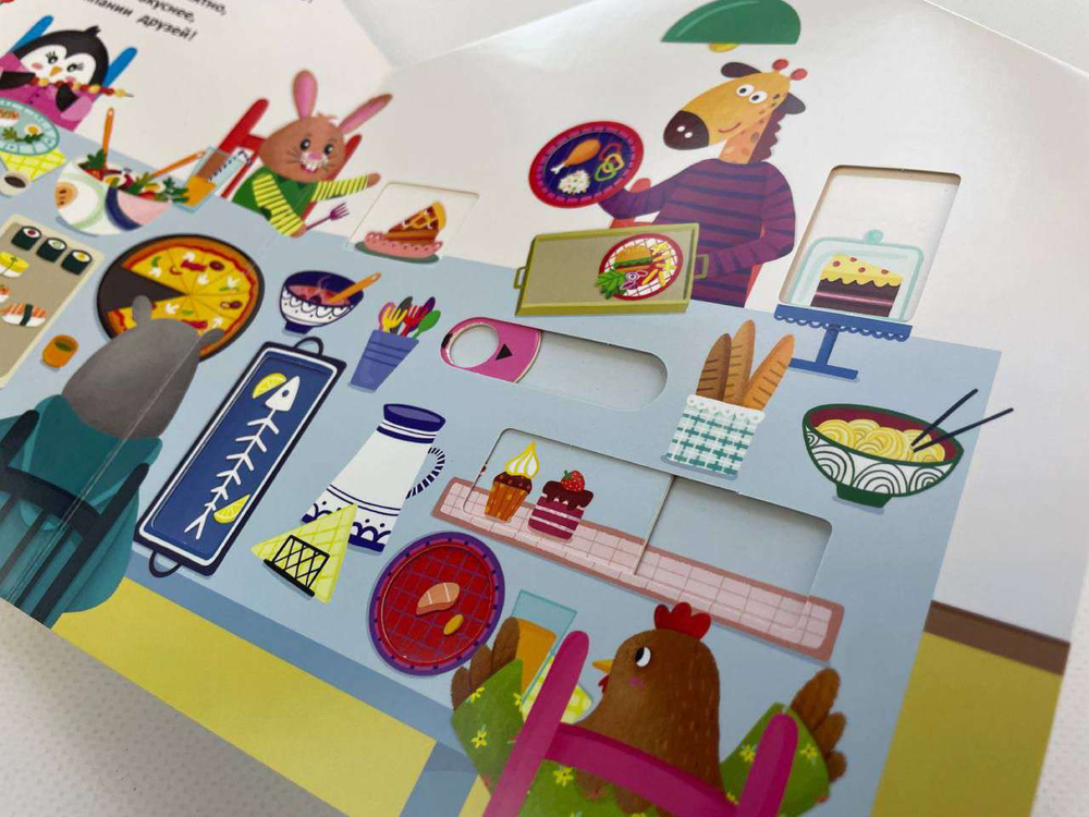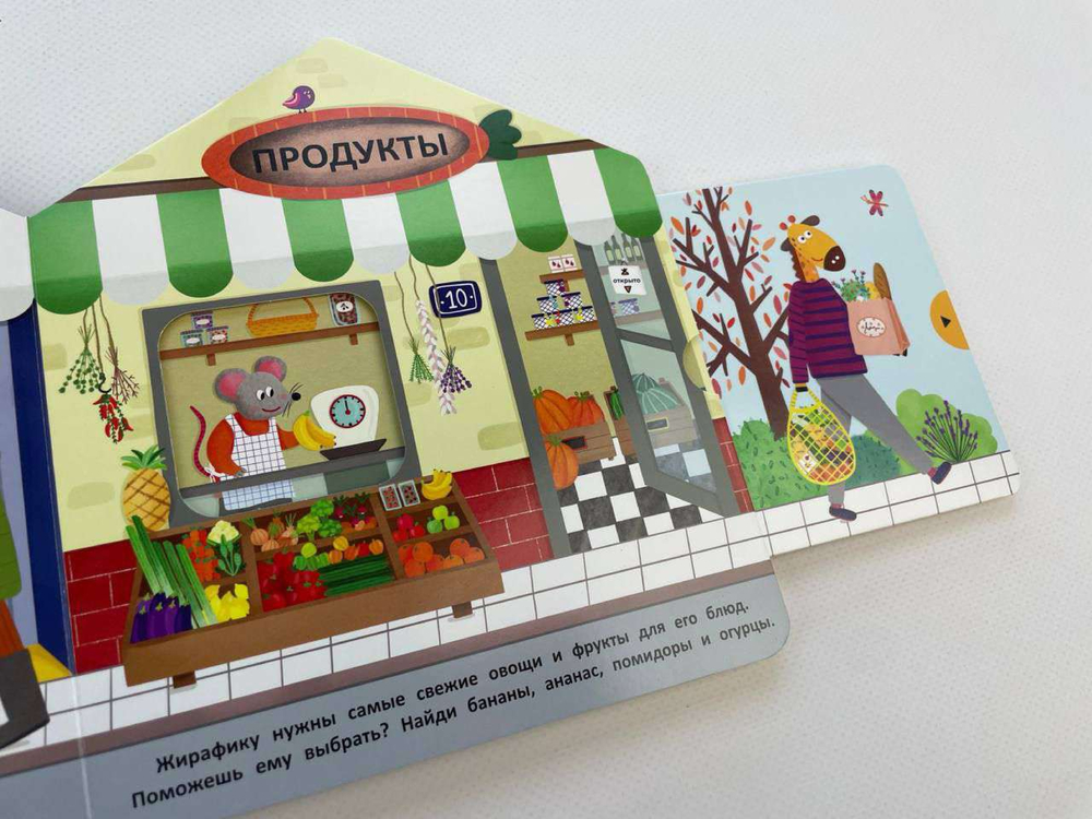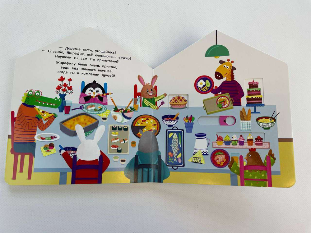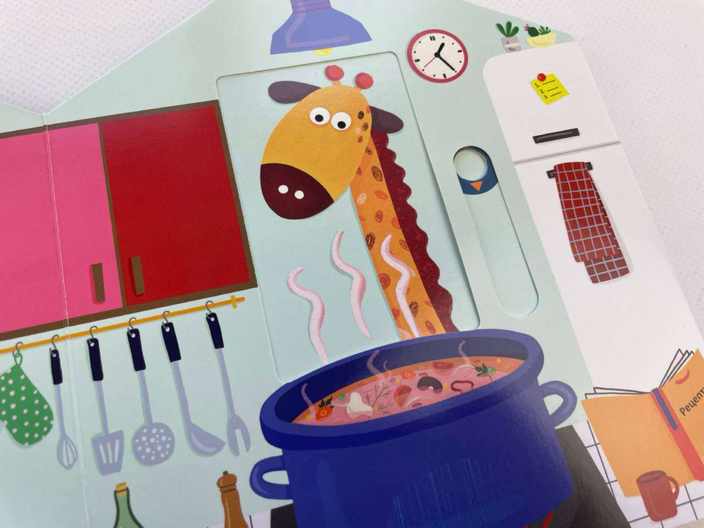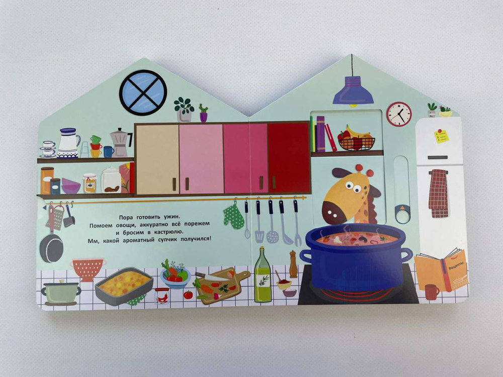 В этой интерактивной книжке-игрушке много сюрпризов: малыш сможет заглянуть в каждую комнату домика и узнать, чем любит заниматься дружелюбный хозяин. А ещё открыть холодильник, сходить в магазин и приготовить угощение для друзей.
