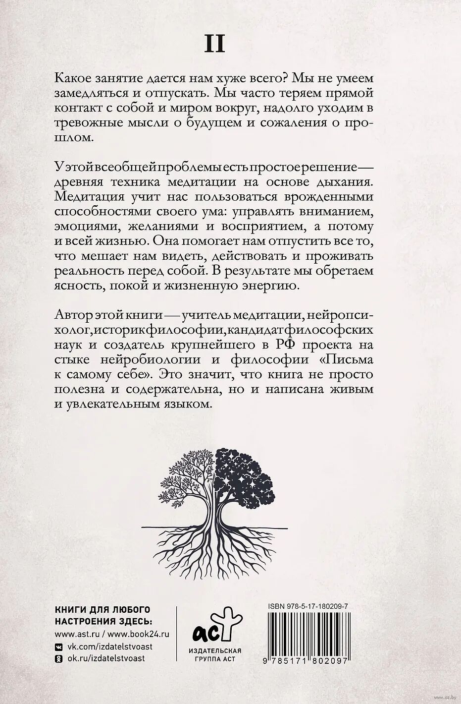 У этой всеобщей проблемы есть простое решение – древняя техника медитации на основе дыхания. Медитация учит нас пользоваться врожденными способностями своего ума: управлять вниманием, эмоциями, желаниями и восприятием, а потому и всей жизнью. Она помогает нам отпустить все то, что мешает нам видеть, действовать и проживать реальность перед собой. В результате мы обретаем ясность, покой и жизненную энергию.