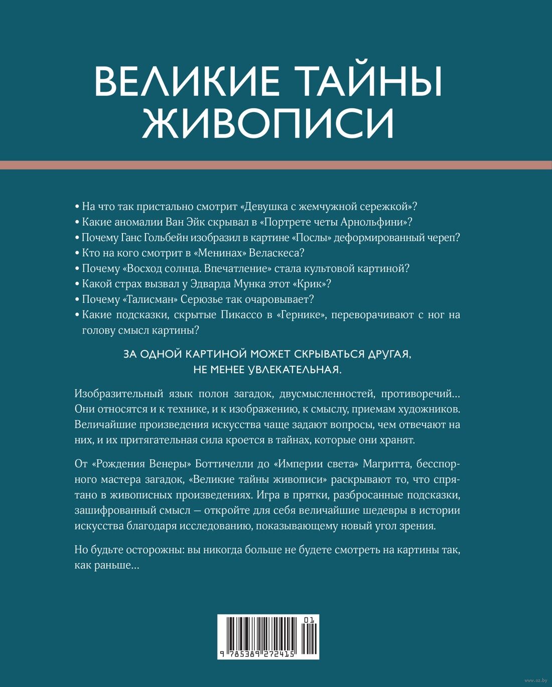 Загадки самых великих произведений искусства – от фресок Помпей до картины Пикассо в книге "Великие тайны живописи". Вы узнаете о чем думали художники, что они прятали от своих современников, и что оказалось практически скрыто для нас за пеленой столетий.