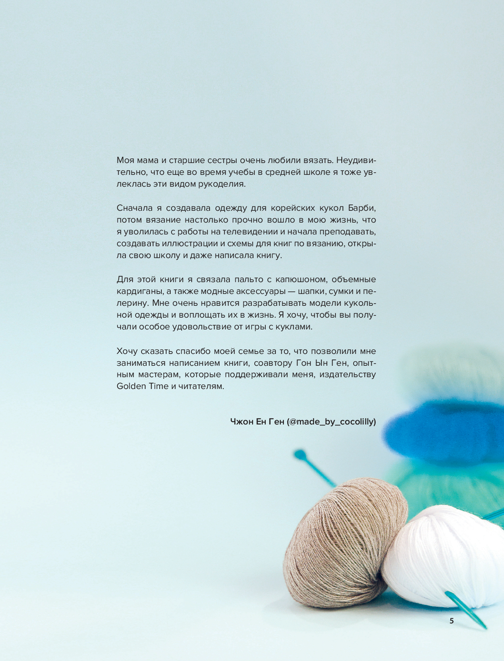 Вы станете настоящим дизайнером современной одежды для кукол! Вместе с лучшими корейскими мастерами вы свяжете спицами 24 удивительных проекта миниатюрной одежды. Кардиганы, юбки, пуловеры, сумочки и шапочки – каждая модель детально проработана и не уступает настоящей одежде. По понятным схемам и порядным описаниям вы легко свяжете модели из книги, даже если никогда не держали в руках спицы или крючок! А в подарок вязальщицам и их детям – два красочных листа с бумажными куклами, которых можно одевать! Ваши дети с удовольствием будут играть, пока мама вяжет!