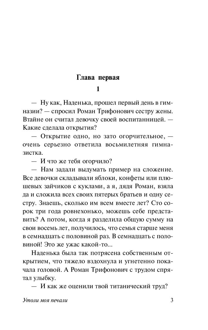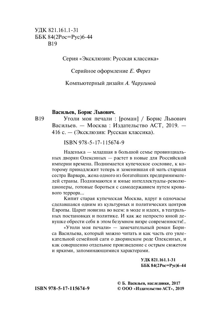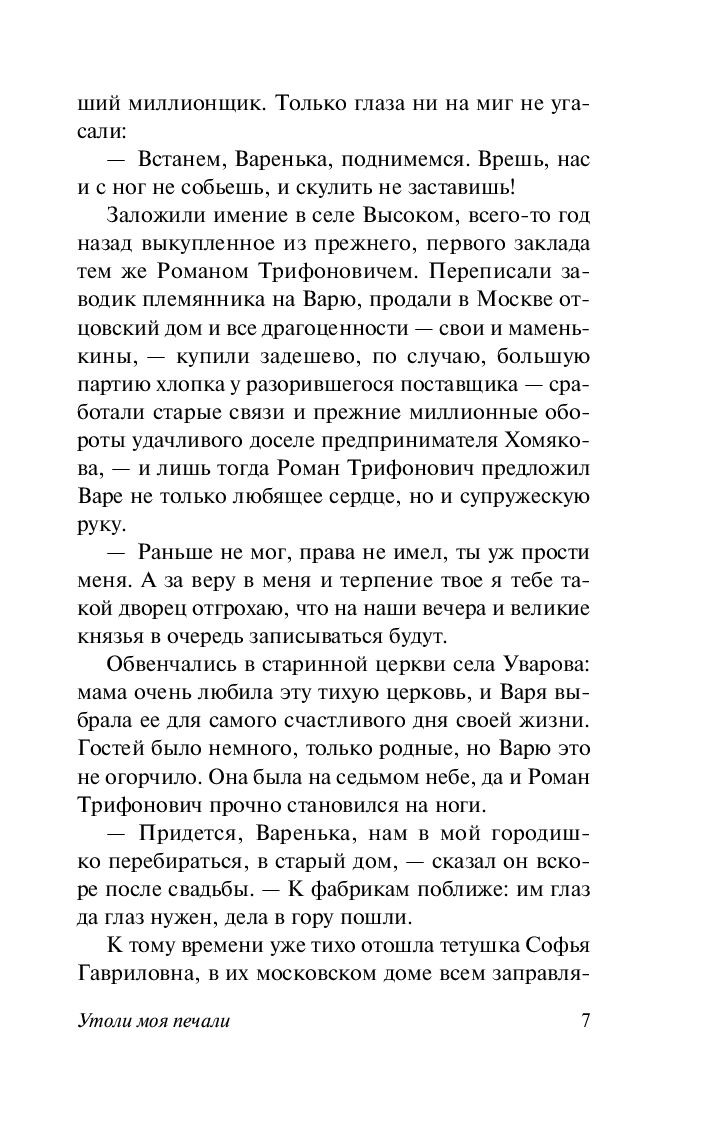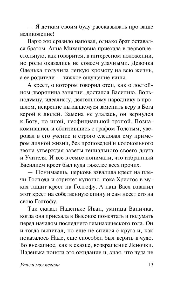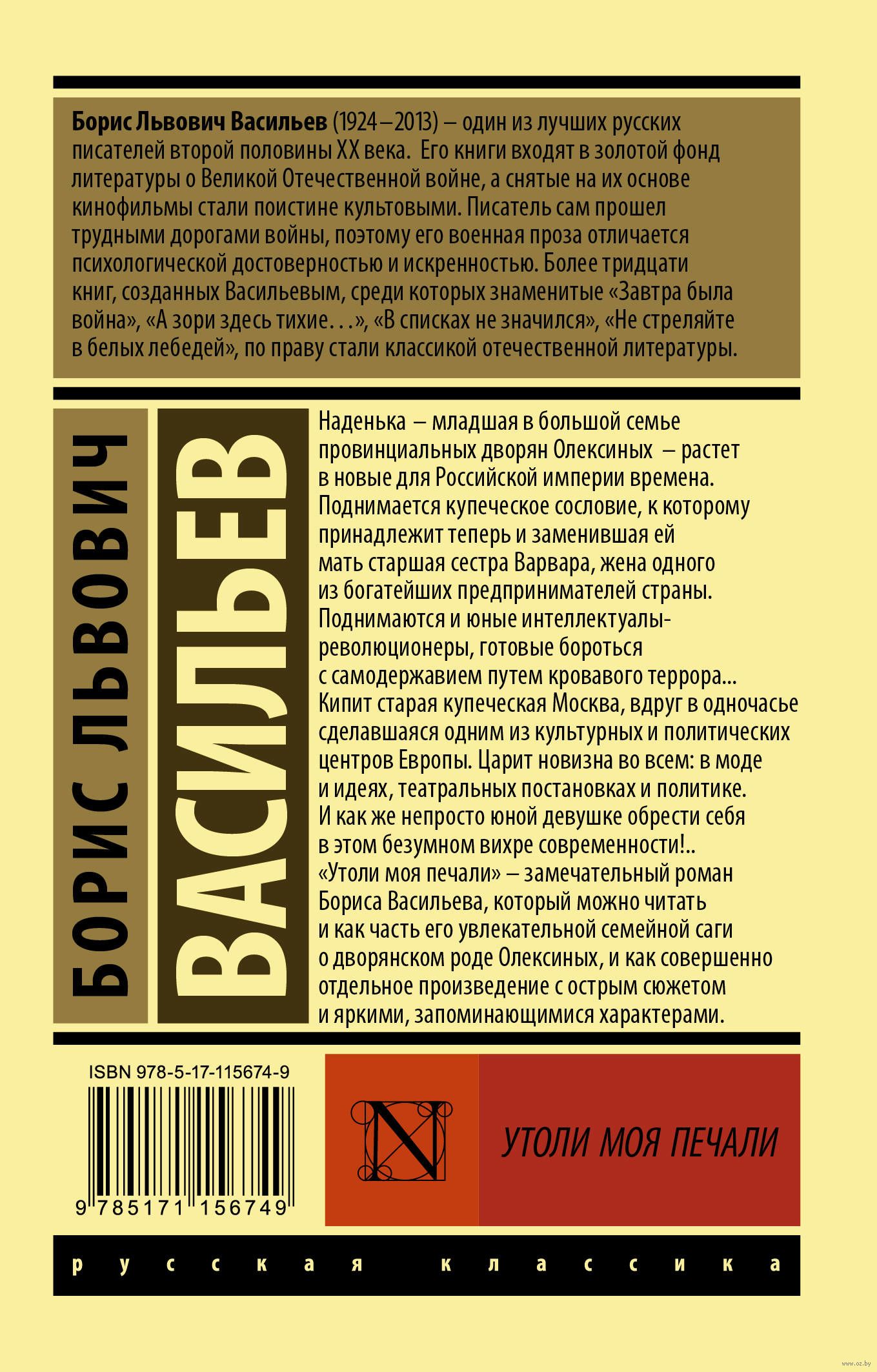 Наденька – младшая в большой семье провинциальных дворян Олексиных – растет в новые для Российской империи времена. Поднимается купеческое сословие, к которому принадлежит теперь и заменившая ей мать старшая сестра Варвара, жена одного из богатейших предпринимателей страны. Поднимаются и юные интеллектуалы-революционеры, готовые бороться с самодержавием путем кровавого террора... Кипит старая купеческая Москва, вдруг в одночасье сделавшаяся одним из культурных и политических центров Европы. Царит новизна во всем: в моде и идеях, театральных постановках и политике. И как же непросто юной девушке обрести себя в этом безумном вихре современности!.. "Утоли моя печали" – замечательный роман Бориса Васильева, который можно читать и как часть его увлекательной семейной саги о дворянском роде Олексиных, и как совершенно отдельное произведение с острым сюжетом и яркими, запоминающимися характерами.