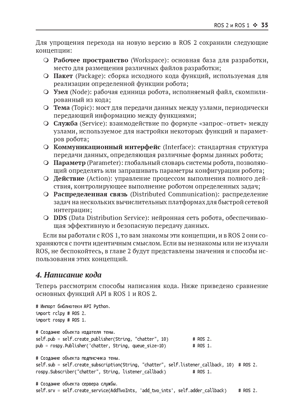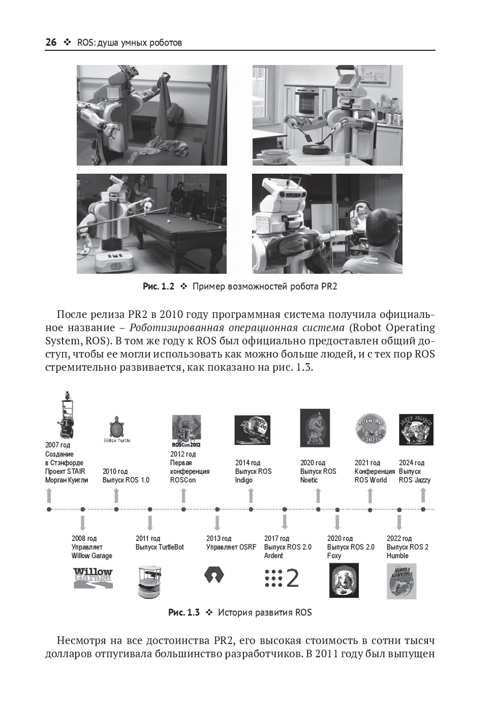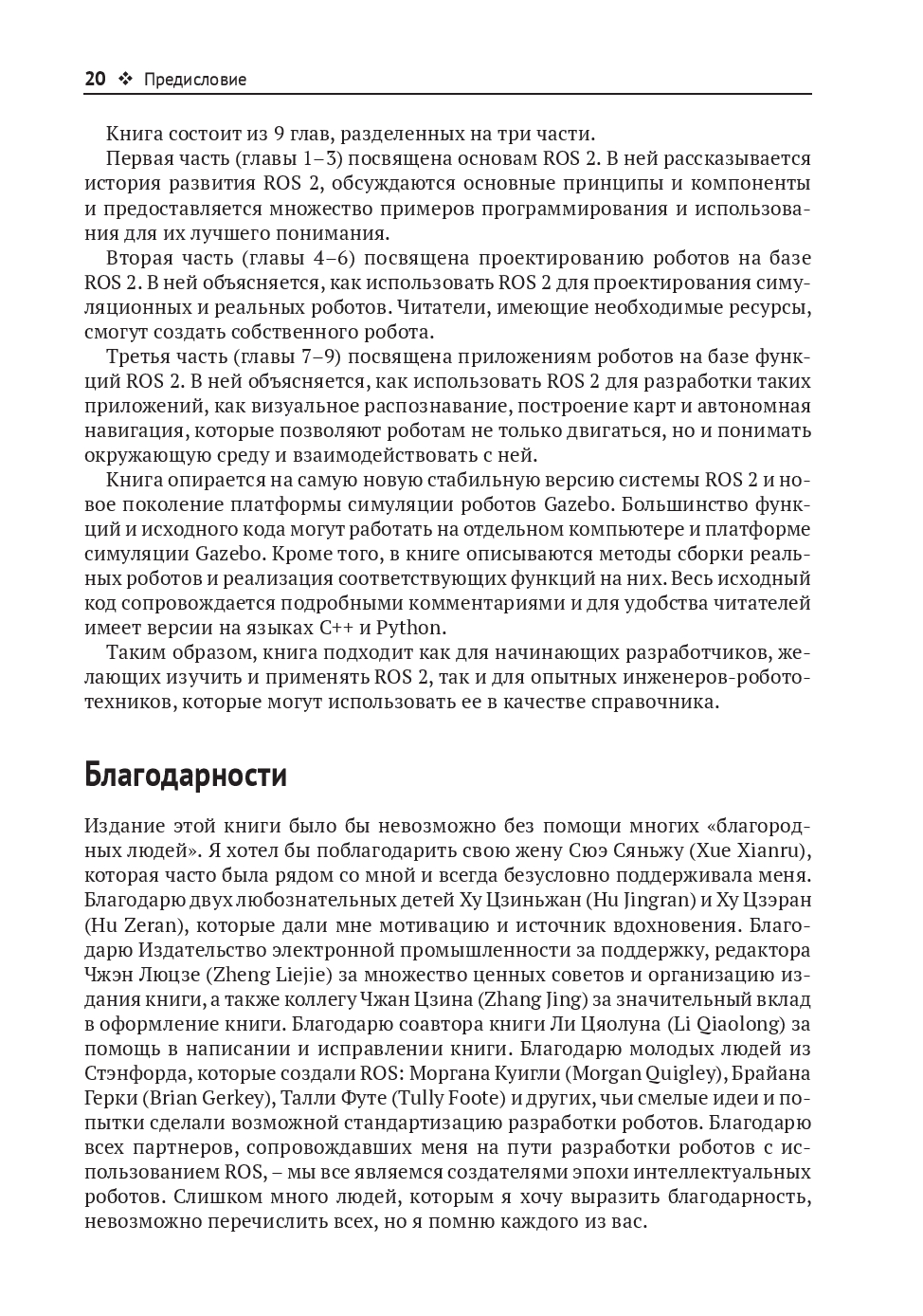 Книга посвящена основным принципам работы с операционной системой для роботов ROS 2 и практике разработки роботов. В ней приводятся подробные объяснения ключевых концепций, компонентов и инструментов ROS 2 и рассматриваются методы построения симуляционных и реальных робототехнических систем, а также способы применения ROS 2 для задач компьютерного зрения, построения карт и автономной навигации. Книга снабжена большим количеством иллюстраций, схем и исходного кода на языках C++ и Python, что позволяет не только освоить базовые функции ROS 2, но и глубже понять методы разработки роботов и применить полученные знания на практике.