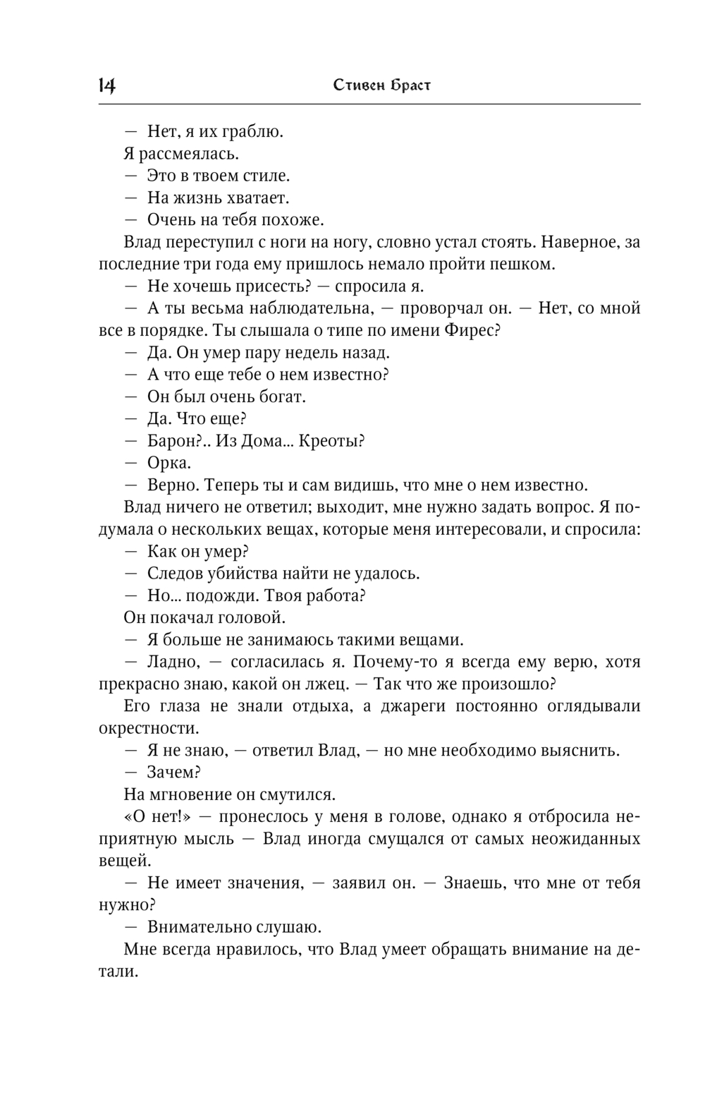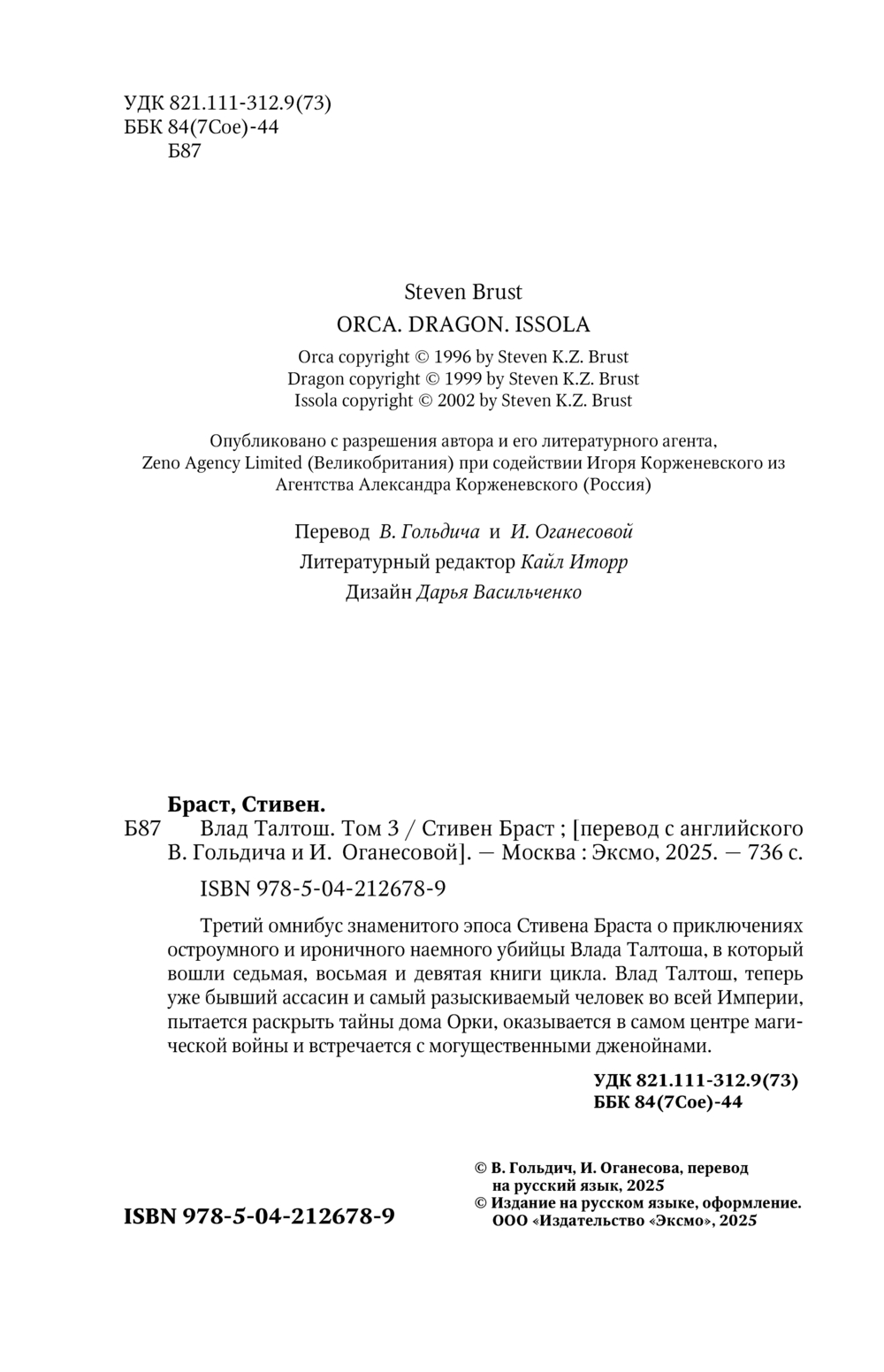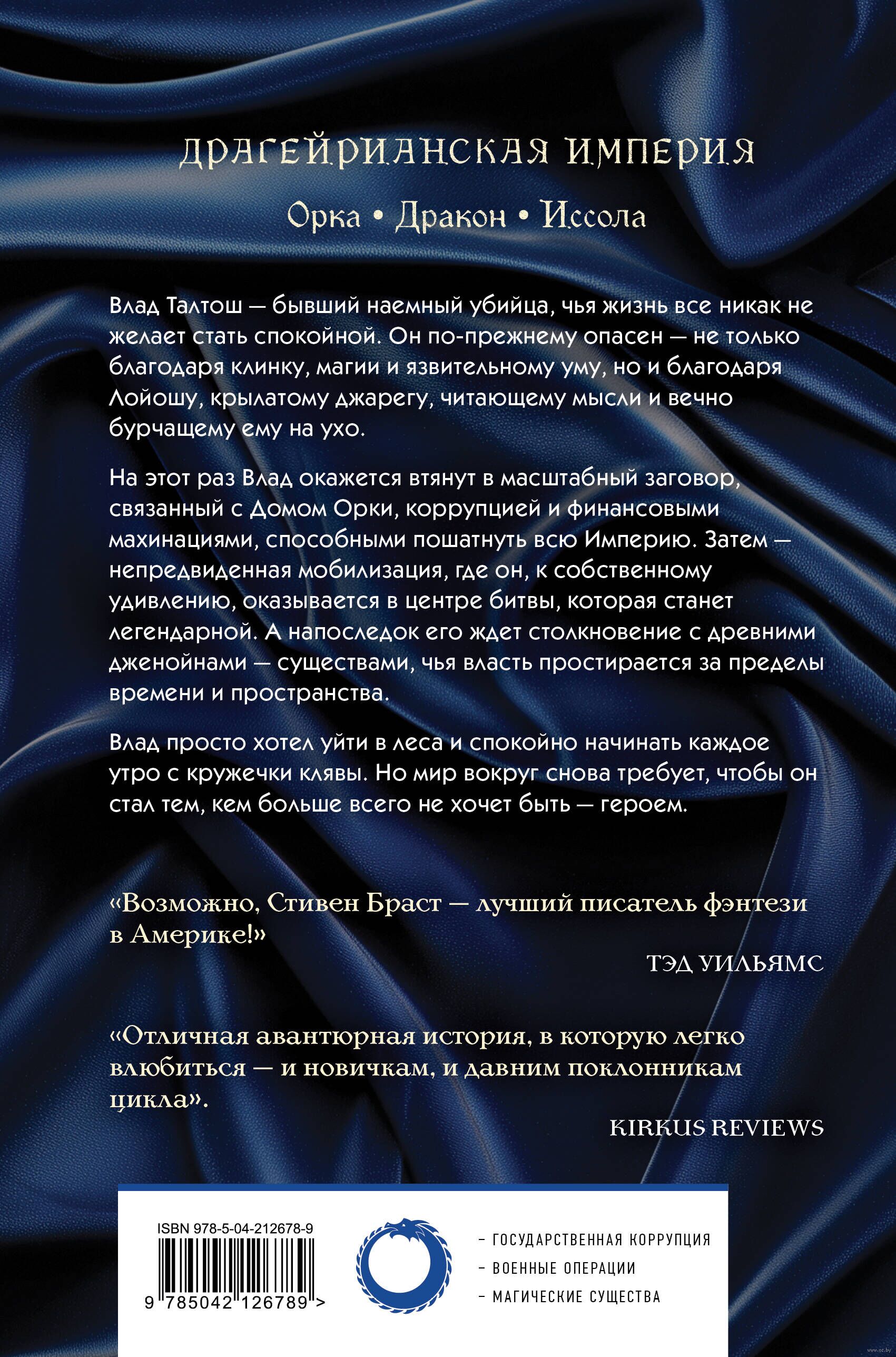 Третий омнибус знаменитого эпоса Стивена Браста о приключениях остроумного и ироничного наемного убийцы Влада Талтоша, в который вошли седьмая, восьмая и девятая книги цикла. Влад Талтош, теперь уже бывший ассасин и самый разыскиваемый человек во всей Империи, пытается раскрыть тайны дома Орки, оказывается в самом центре магической войны и встречается с могущественными дженойнами.