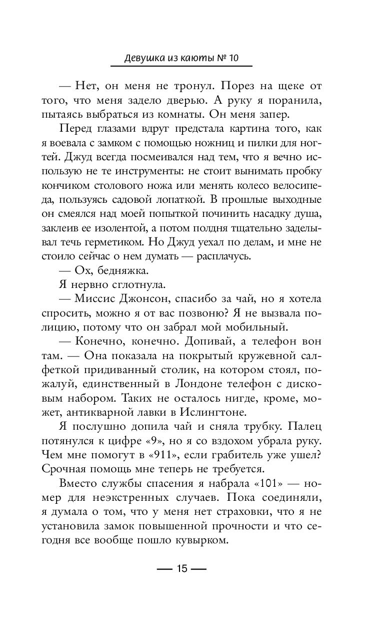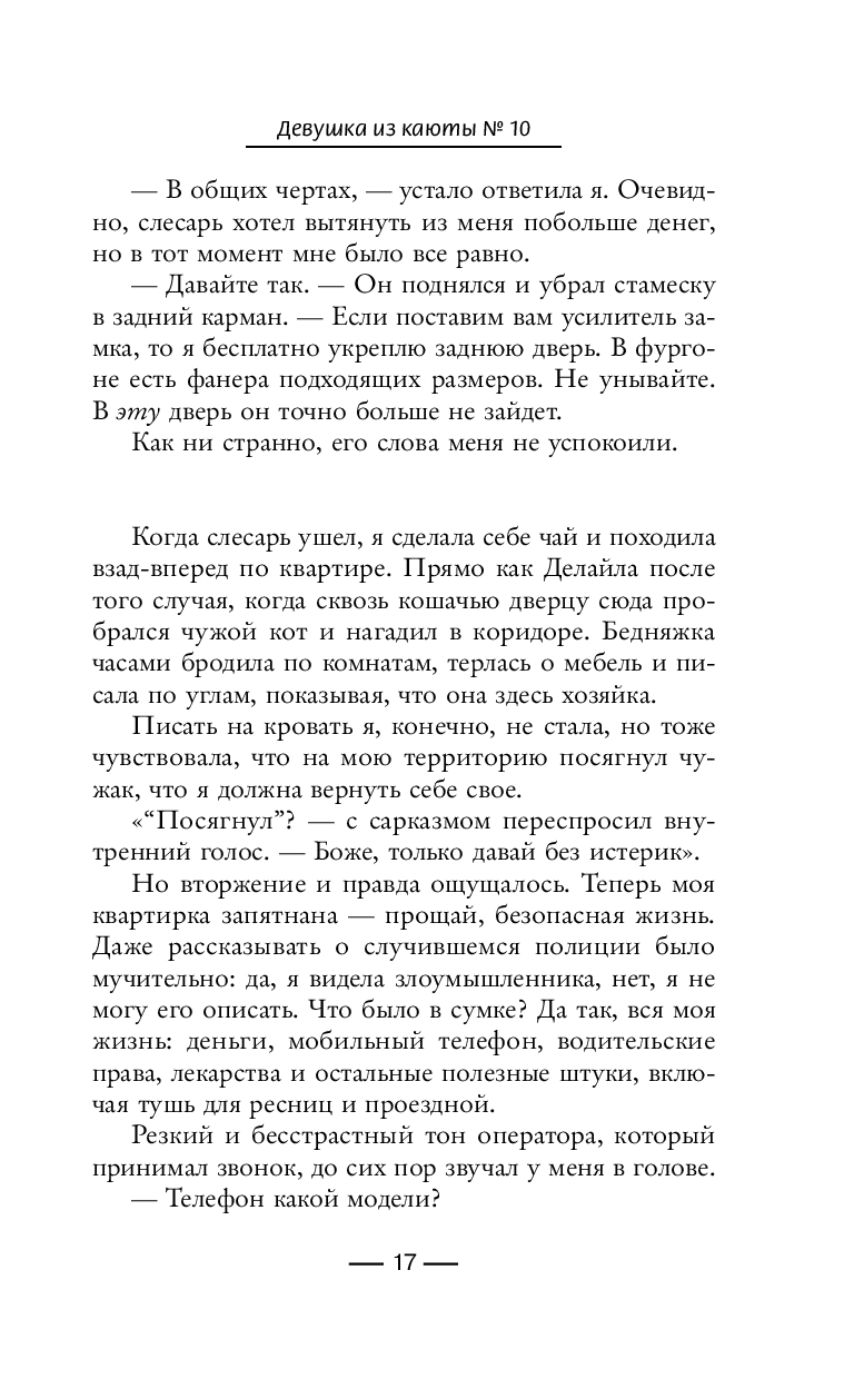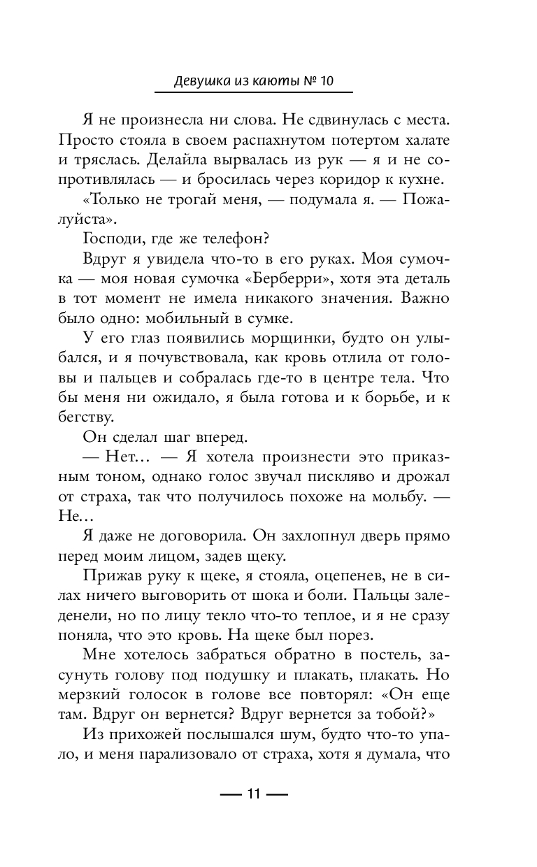 Проснувшись ночью, Ло слышит странный звук, будто за борт выбросили тело. Выбежав на балкон, она видит кровь на стекле соседней каюты № 10 и вызывает охрану... Но записи показывают: никто не заходил в эту каюту, а все пассажиры на борту. Ло вынуждена признать, что, возможно, ошиблась – или оказалась в ловушке на одном лайнере с убийцей...