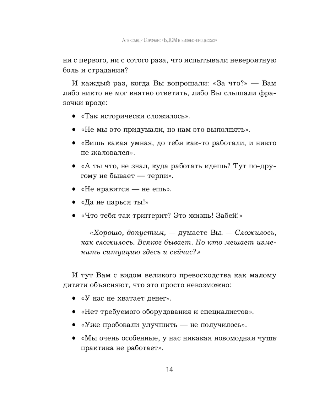 БДСМ – это аббревиатура, за которой скрываются главные болевые зоны бизнеса: Бюрократия, Диджитал, Система управления и Мышление. То есть неоправданно сложные процедуры и неработающие правила, бесполезные ИТ-решения, отсутствие четких и понятных целей и равнодушие менеджеров и сотрудников к проблемам клиентов и компании. Каждая из этих зон пожирает деньги и время. Вот только, какой бы очевидной ни казалась проблема, найти ее и устранить не так-то просто.