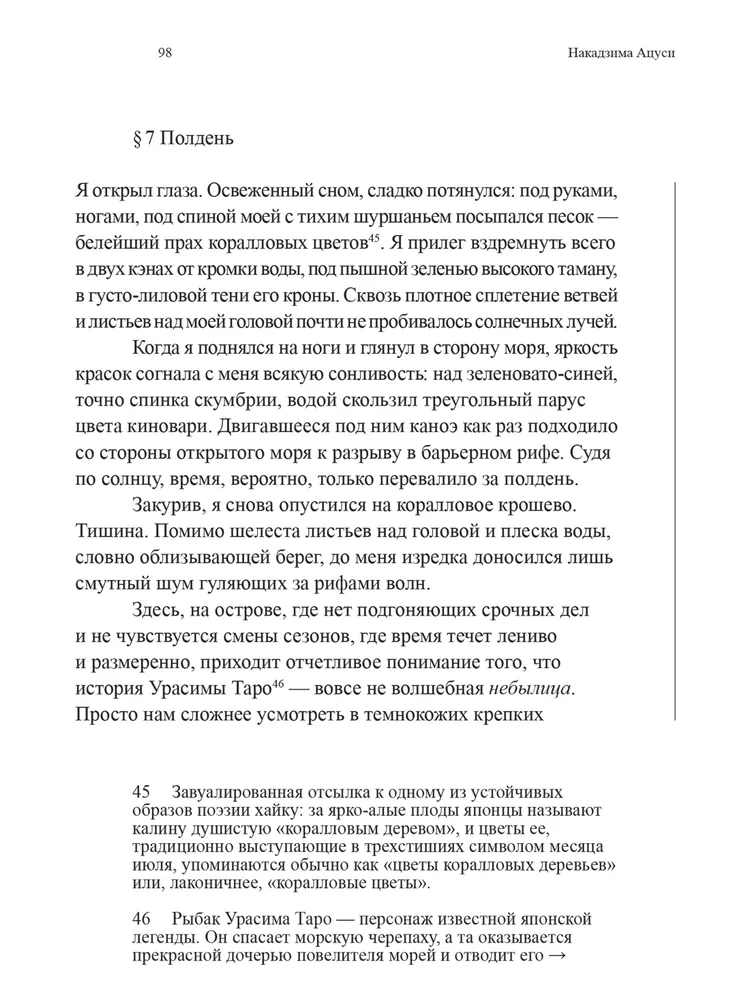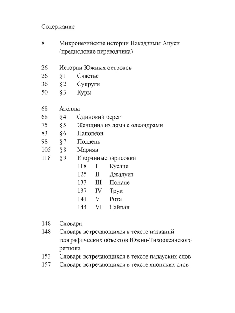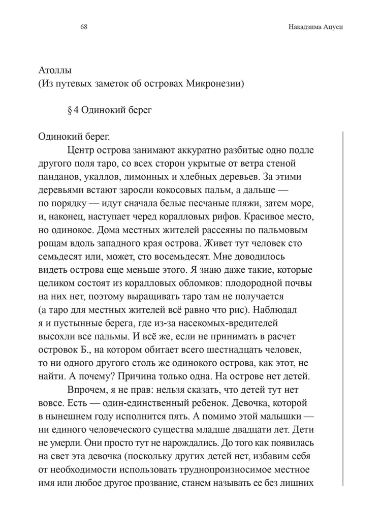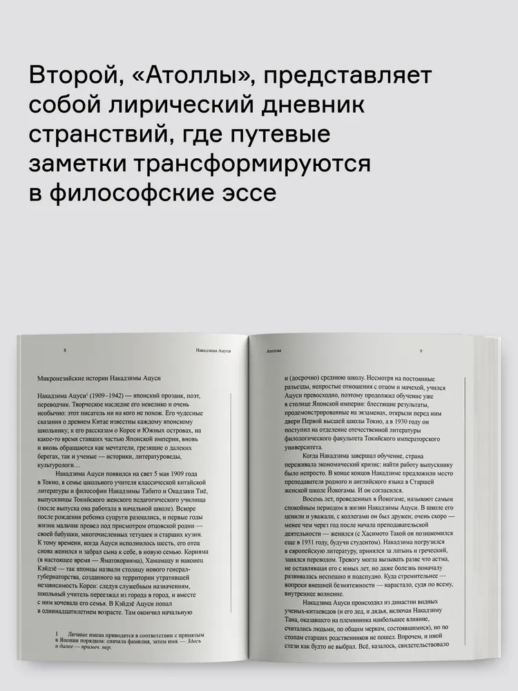 "Атоллы" – сборник малой прозы японского писателя Накадзимы Ацуси (1909–1942), чье творчество сочетает глубокую философскую медитацию с тонким поэтизмом. В издание вошли два цикла произведений: "Истории Южных островов" и "Атоллы", где автор, отталкиваясь от личного опыта пребывания в Микронезии в 1941 году, возводит хрупкие мосты между временами и мироощущениями. Накадзима, известный своим переосмыслением китайских легенд, здесь обращается к колониальной тематике, исследуя столкновение культур и природу власти. Первый цикл, "Истории Южных островов", включает притчи и рассказы, вдохновленные местными мифами и преданиями и переплетающиеся с бытом островитян. Второй, "Атоллы", представляет собой лирический дневник странствий, где путевые заметки трансформируются в философские эссе. Проза Накадзимы лаконична и детализирована, а его взгляд – одновременно отстраненный и проникновенный – делает эти тексты уникальными свидетельствами эпохи.