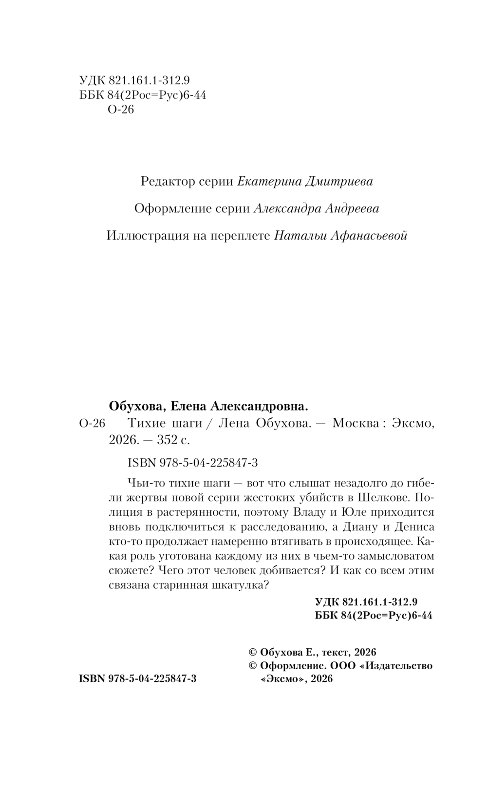 Чьи-то тихие шаги – вот что слышат незадолго до гибели жертвы новой серии жестоких убийств в Шелково. Полиция в растерянности, поэтому Владу и Юле приходится вновь подключиться к расследованию, а Диану и Дениса кто-то продолжает намеренно втягивать в происходящее. Какая роль уготована каждому из них в чьем-то замысловатом сюжете? Чего этот человек добивается? И как со всем этим связана старинная шкатулка?