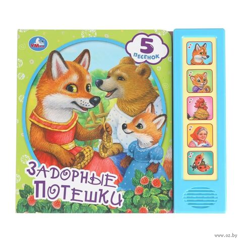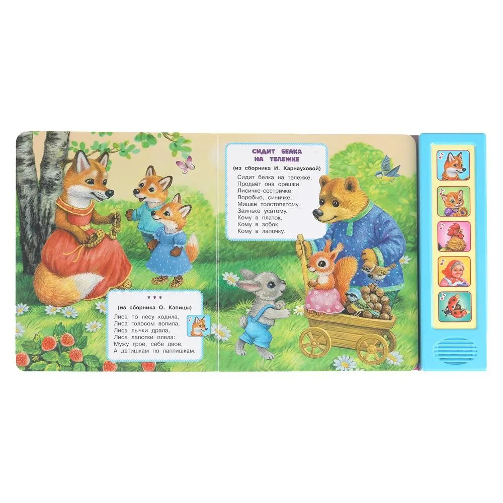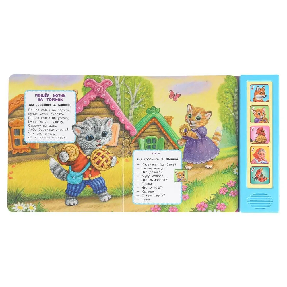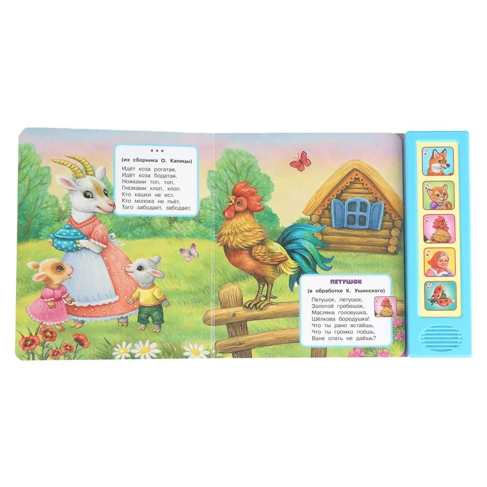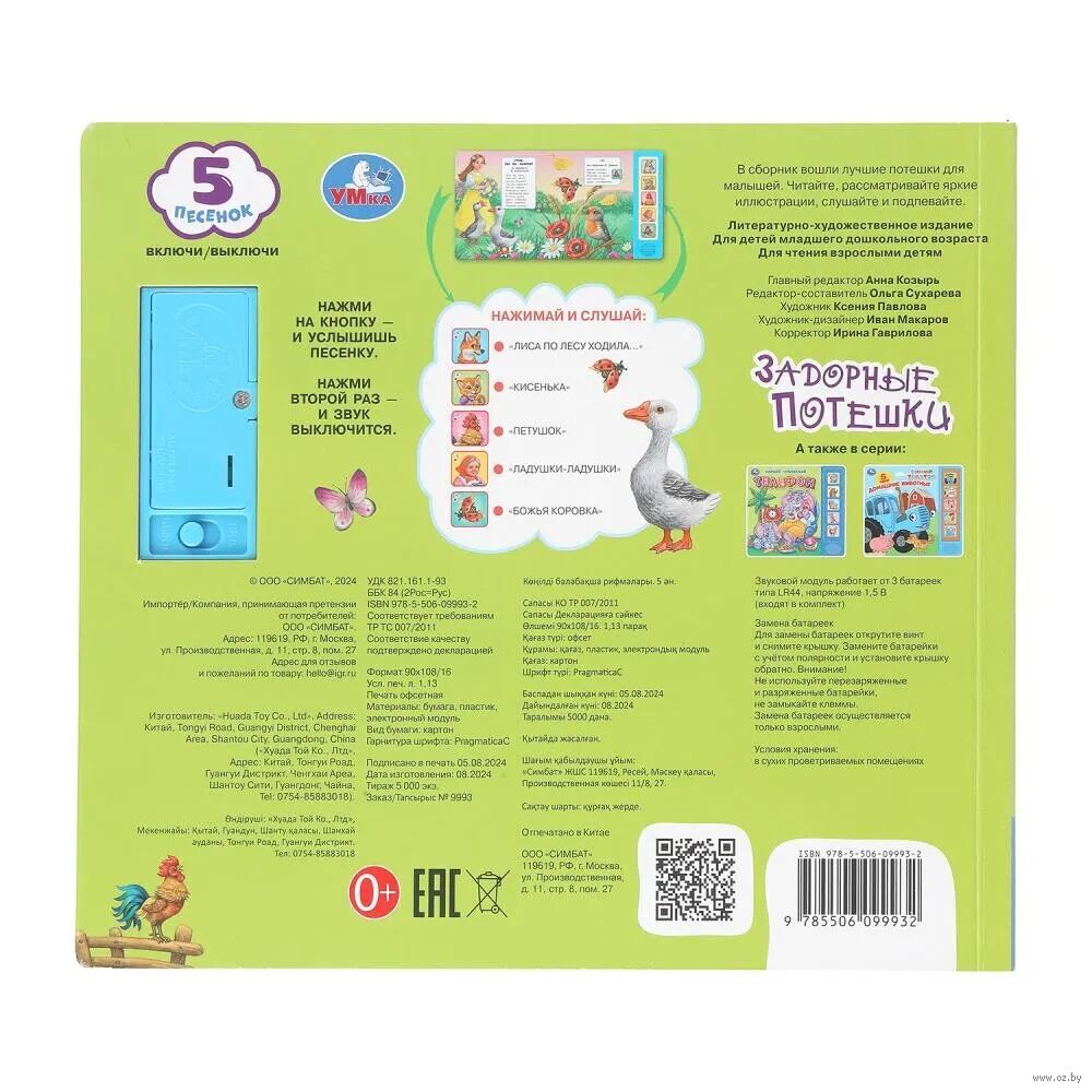 Ребенок с удовольствием будет листать плотные страницы, рассматривать яркие картинки и, конечно, нажимать на кнопку и слушать задорные песенки-потешки. Ребенок легко освоит включение звука: по нажатию на кнопку звук включится, при втором нажатии выключится. Книжка сделана из плотного картона, поэтому родители могут не опасаться за ее сохранность. Благодаря компактному формату ее удобно брать с собой.