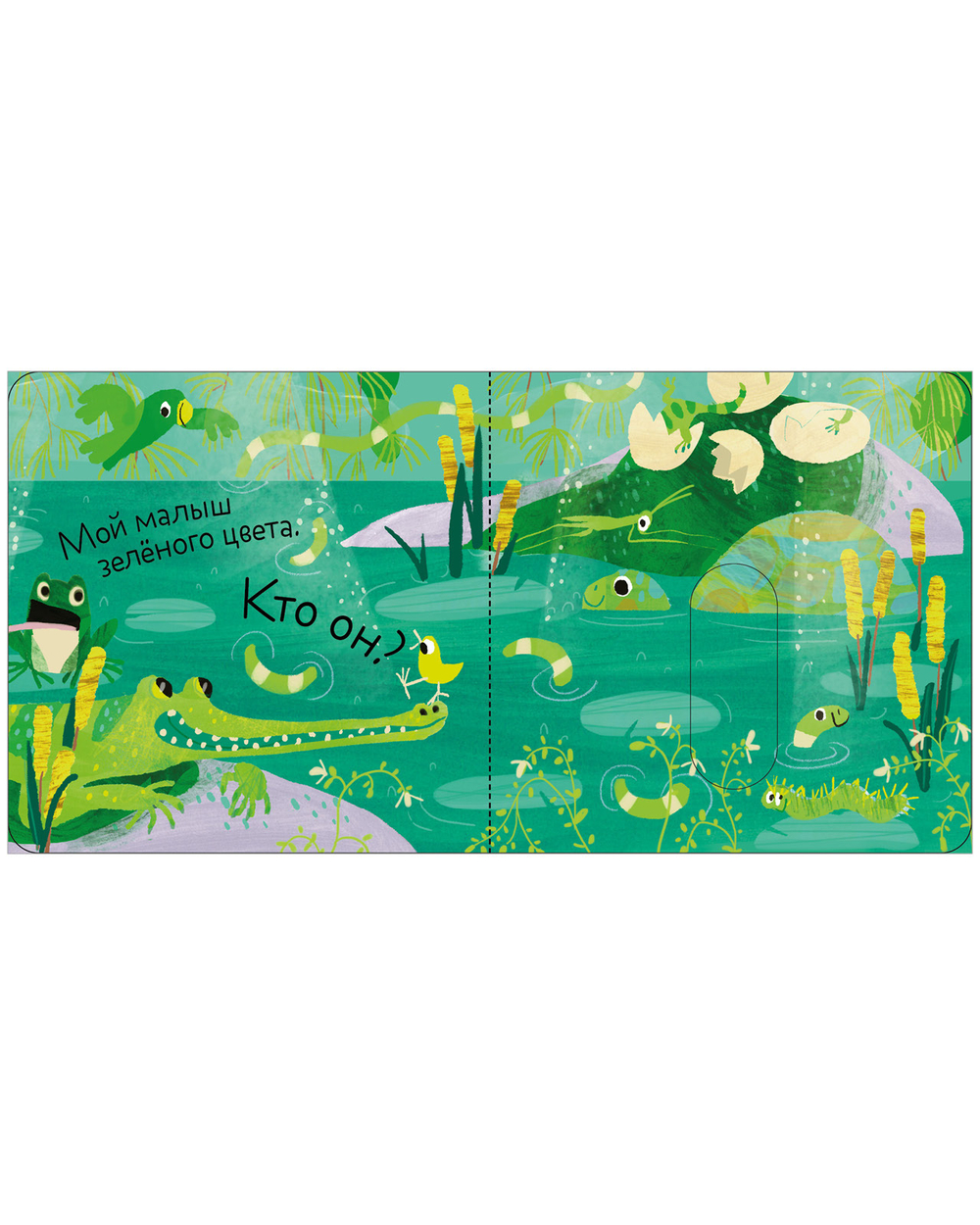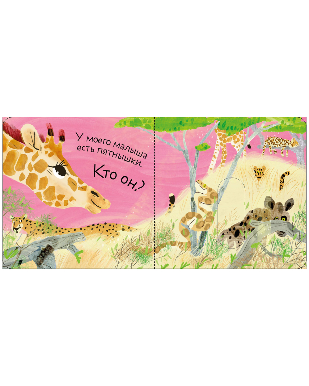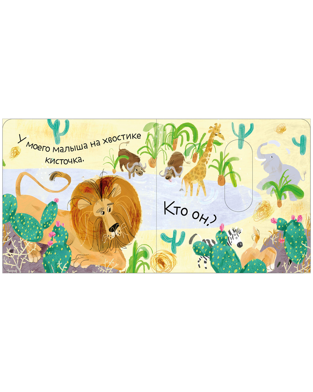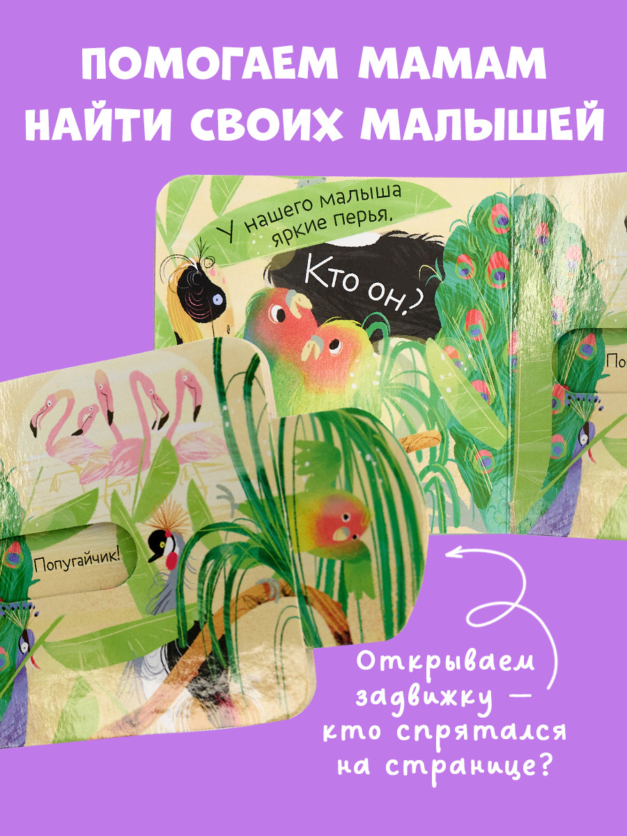 Книжка "Угадай, кто мой малыш?" поможет ребенку узнать новые слова и развить мелкую моторику с веселой игрой "ку-ку, кто там?".