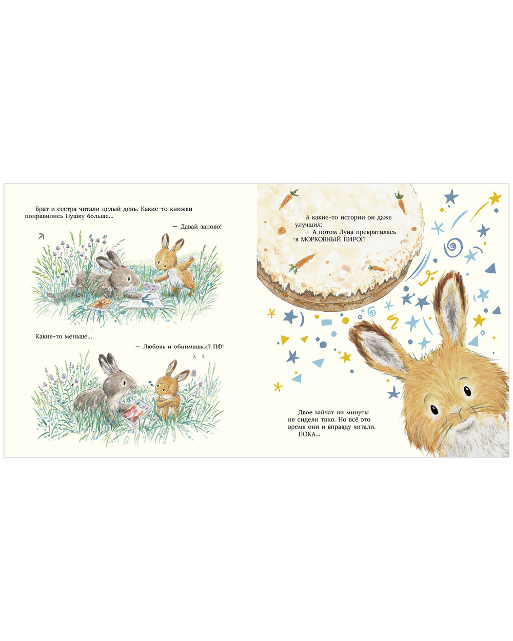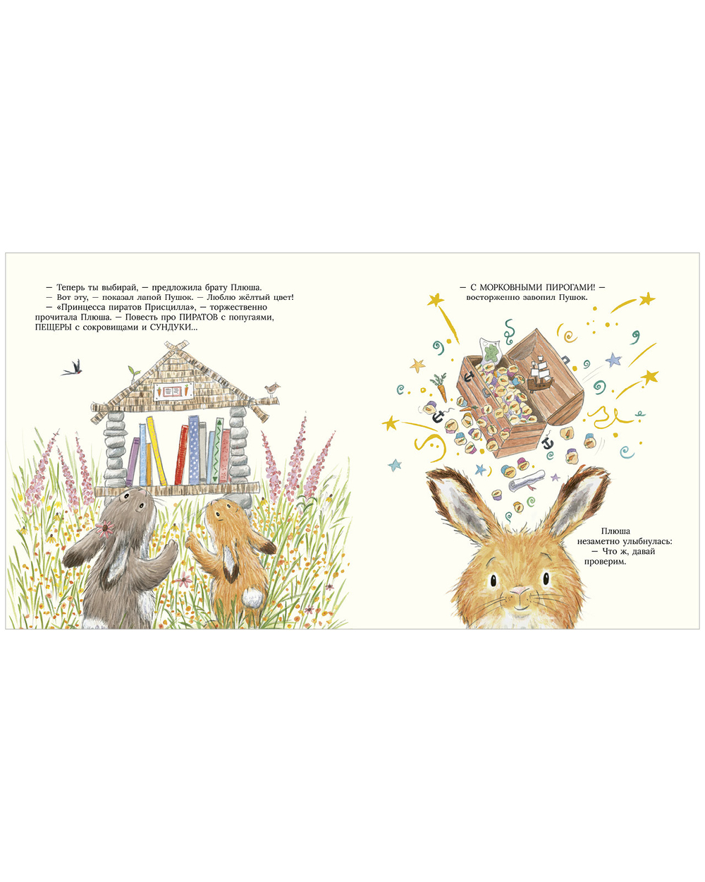Зайчонок Плюша обожала книги. А ее брат Пушок считал, что нет ничего скучнее чтения! Но однажды Пушок обнаружил на страницах книги целый мир невероятных приключений... Зайчата прочитали все книги на полке и решили сочинить свою историю, но, чтобы написать сказку вместе, им придется научиться договариваться!