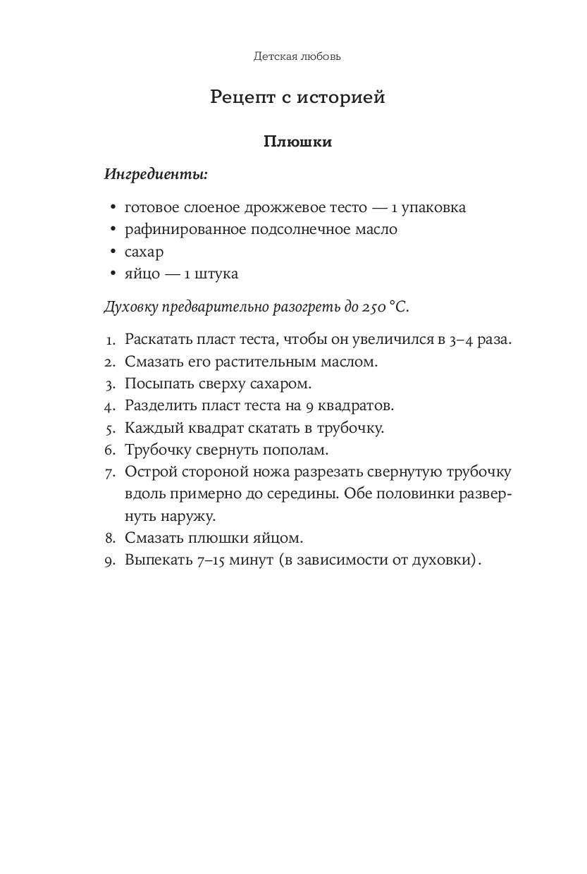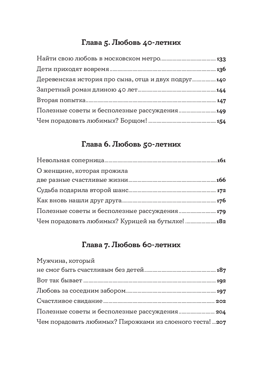 В конце каждой главы автор размышляет над полезными смыслами, которые мы можем извлечь для себя из этих историй, а также делится своими фирменными рецептами, которые подошли бы нашим героям в качестве подарка себе или любимому человеку. Потому что вкусная еда – это тоже про любовь.