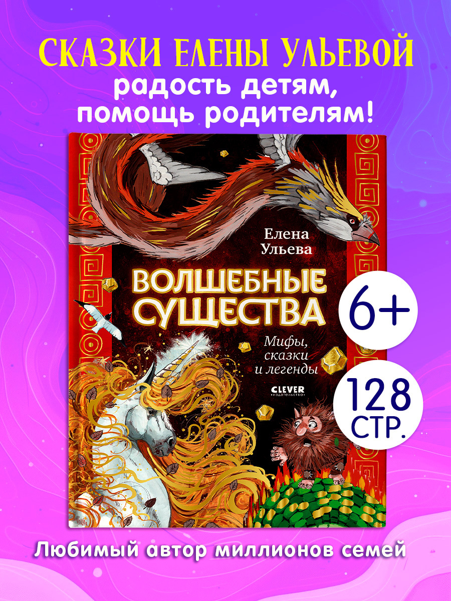 Сборник сказок "Волшебные существа. Мифы, сказки и легенды" в красивой блестящей обложке, который выпустило издательство Clever, прекрасно подойдет для подарка. А еще он понравится школьникам, которые уже начинают сами читать книги для детей и сказки для детей.