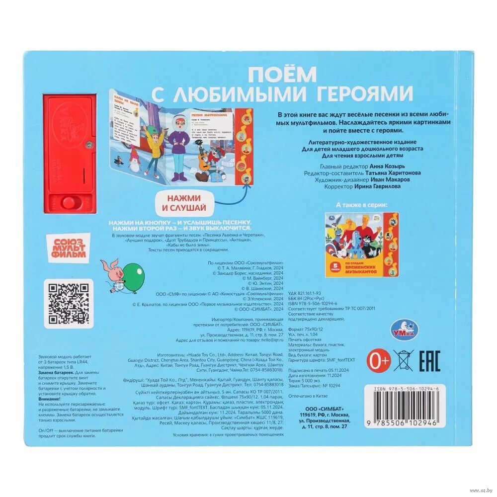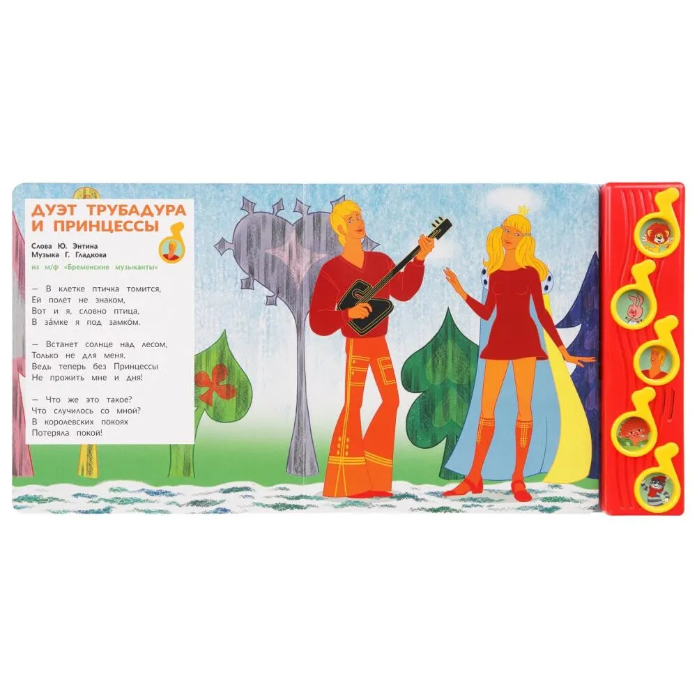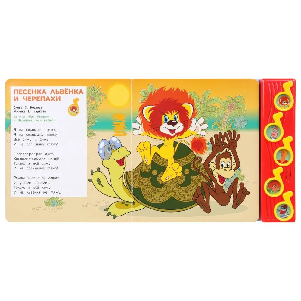 Малыш будет с удовольствием рассматривать яркие страницы, нажимать на кнопки и слушать песенки из любимых м/ф. Одно нажатие на кнопку – песенка включится, второе нажатие – выключится. Книга сделана из плотного картона, поэтому родители могут не опасаться, что ребенок порвет странички. Благодаря компактному формату ее удобно брать с собой.