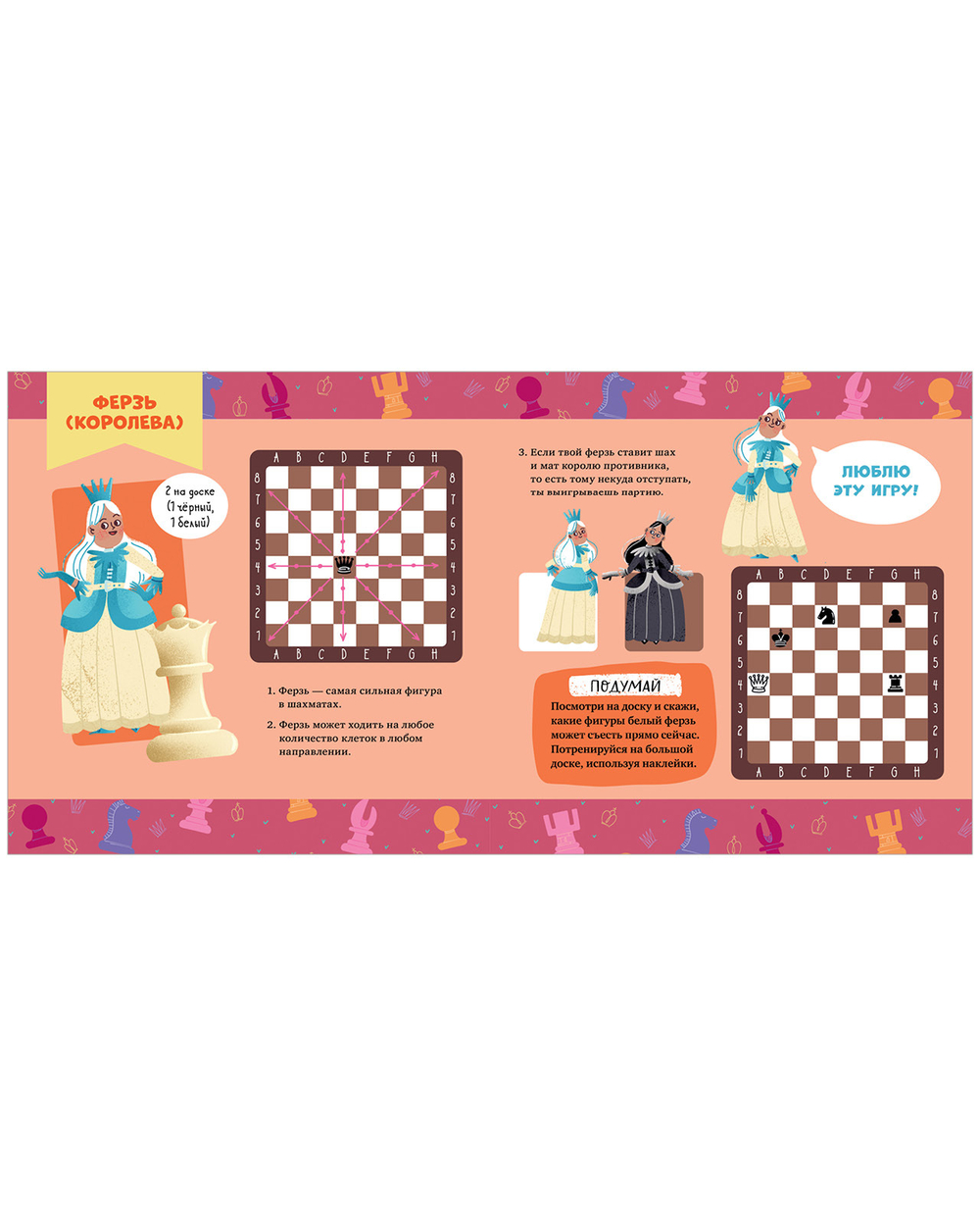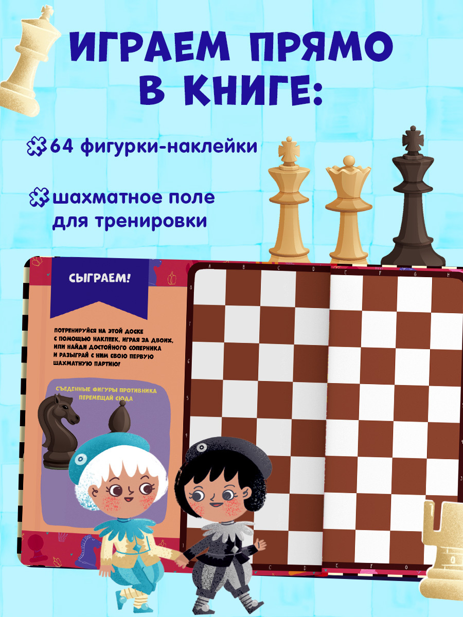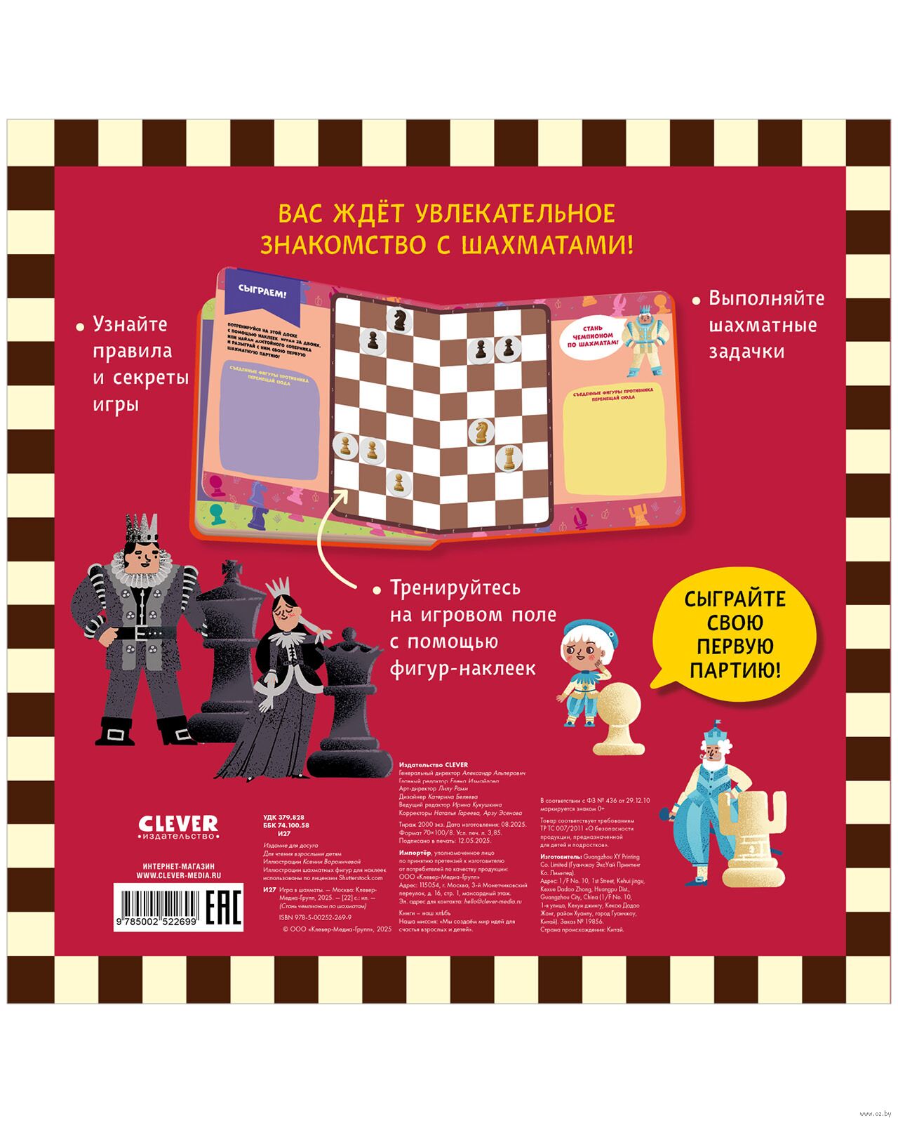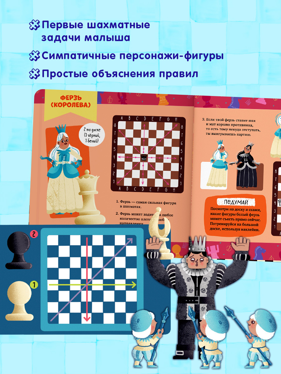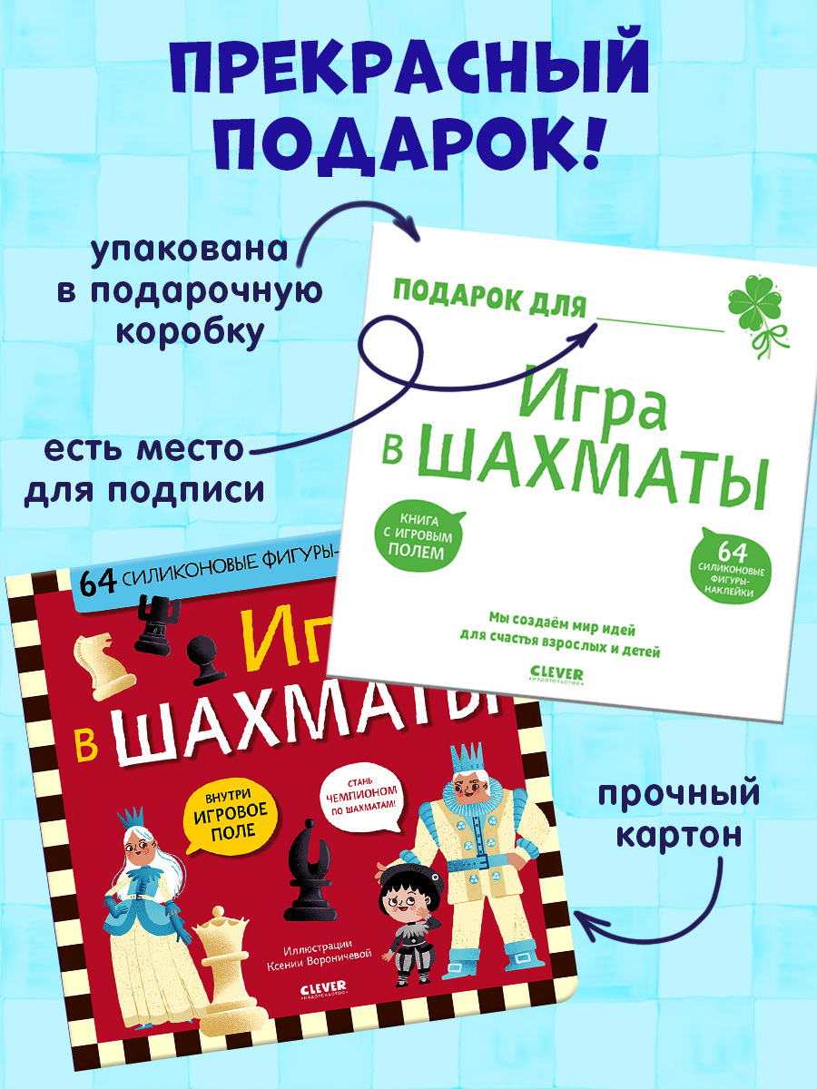 Вместе с симпатичными персонажами – королем, слоном, конем и другими – малыш узнает, какие бывают фигуры, как они ходят, и решит первые шахматные задачи. А еще сможет потренироваться и сыграть свою первую партию на игровом поле с силиконовыми фигурками-наклейками, которые ждут вас внутри этой Сlever книги.
