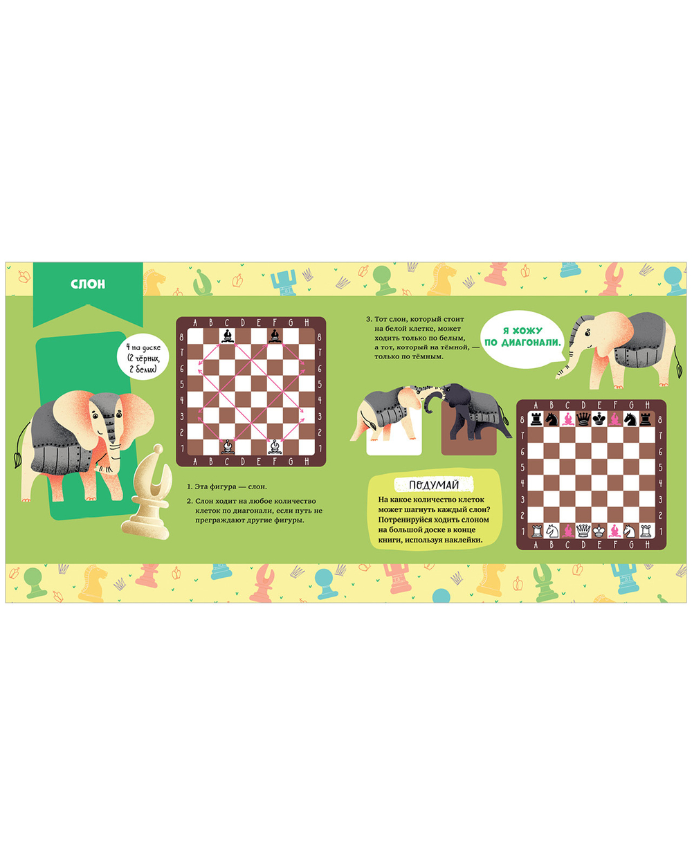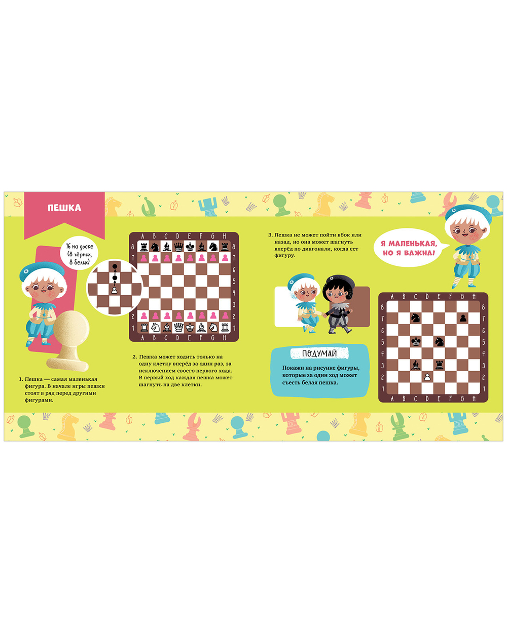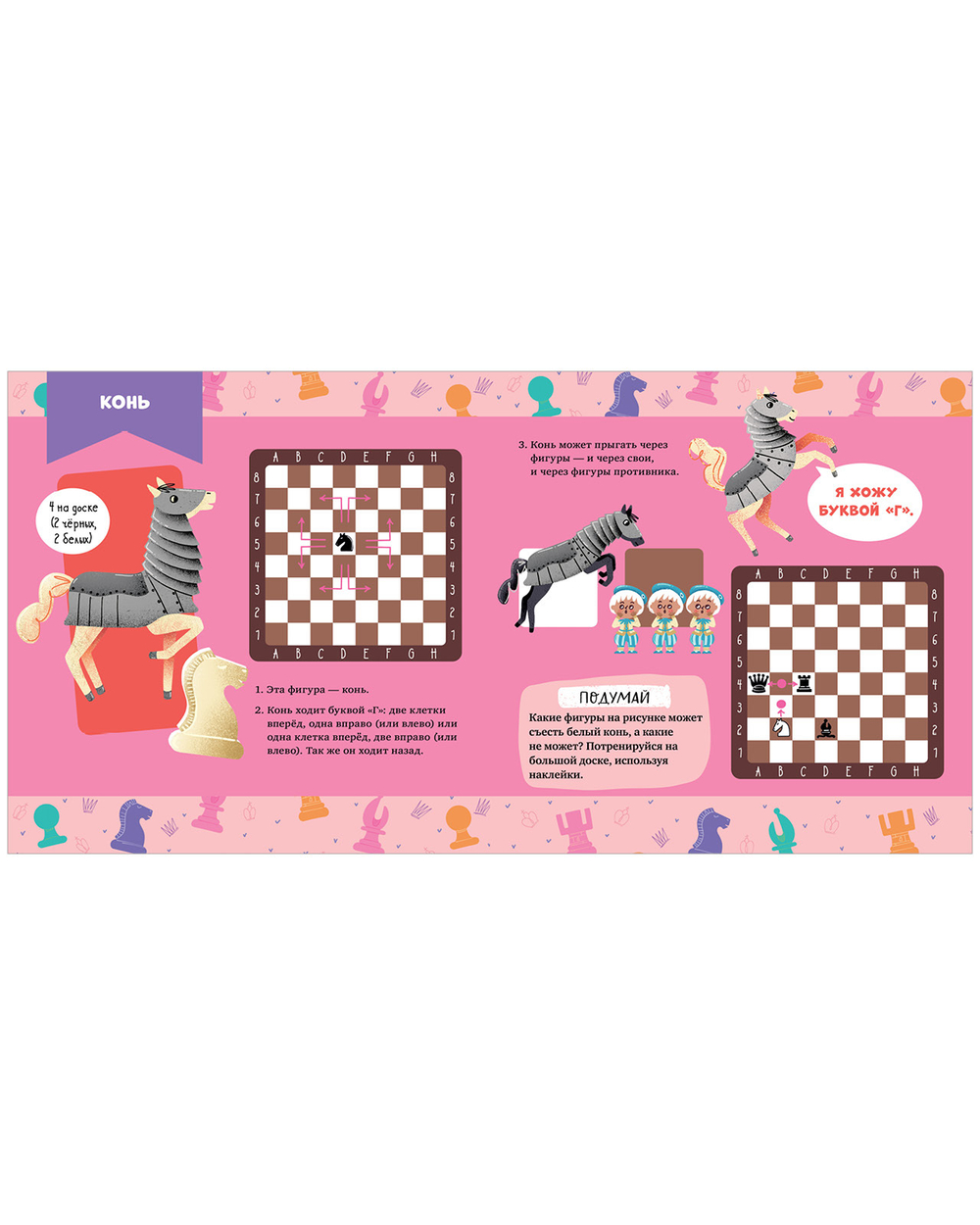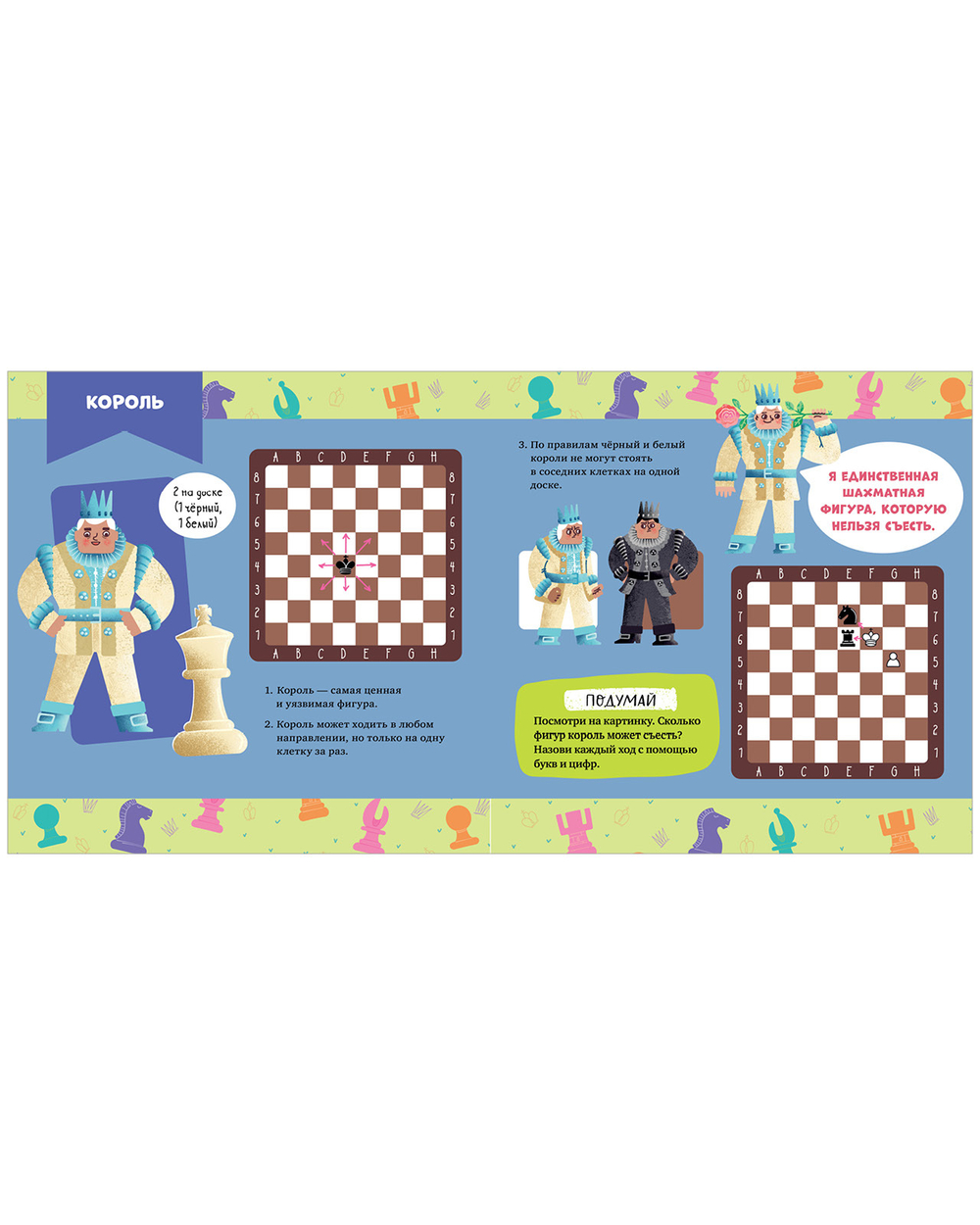 Вместе с симпатичными персонажами – королем, слоном, конем и другими – малыш узнает, какие бывают фигуры, как они ходят, и решит первые шахматные задачи. А еще сможет потренироваться и сыграть свою первую партию на игровом поле с силиконовыми фигурками-наклейками, которые ждут вас внутри этой Сlever книги.
