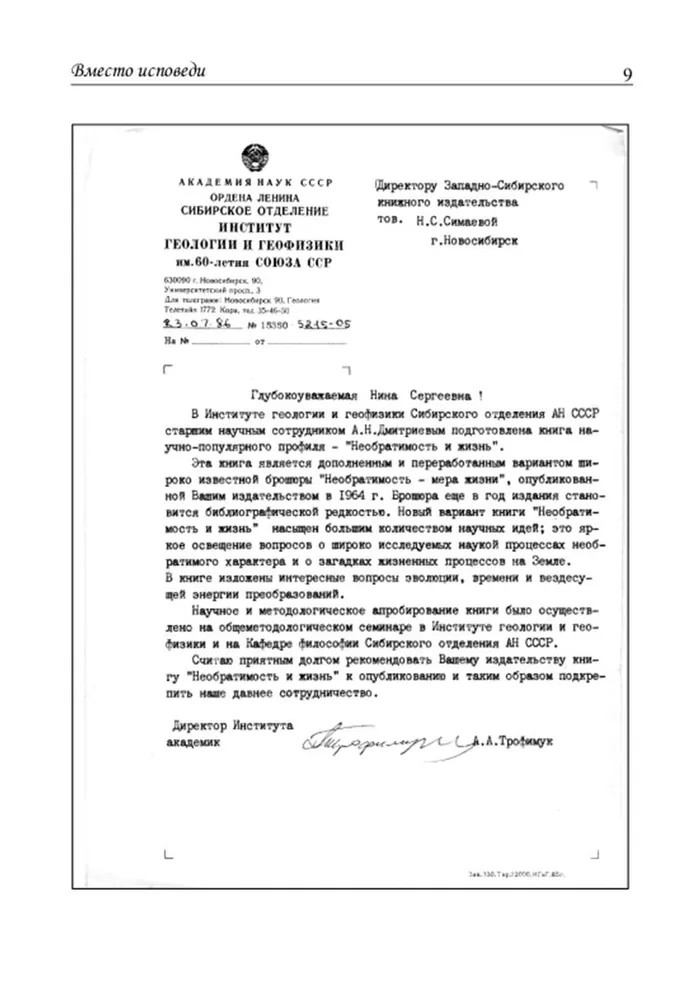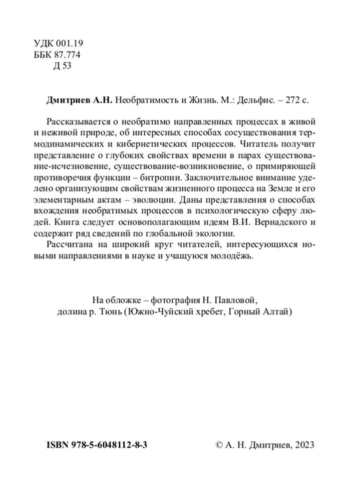 Заключительное внимание уделено организующим свойствам жизненного процесса на Земле и его элементарным актам – эволюции. Даны представления о способах вхождения необратимых процессов в психологическую сферу людей. Книга следует основополагающим идеям В. И. Вернадского и содержит ряд сведений по глобальной экологии.