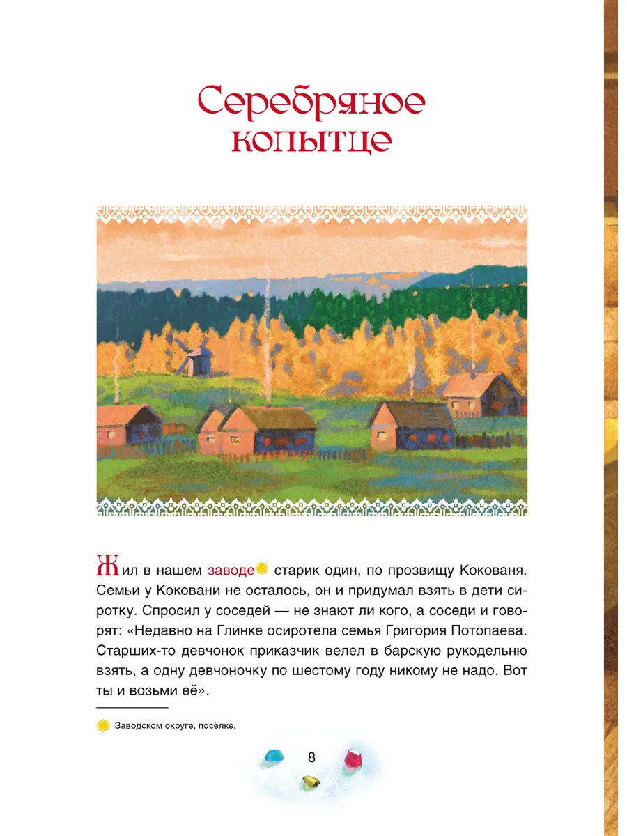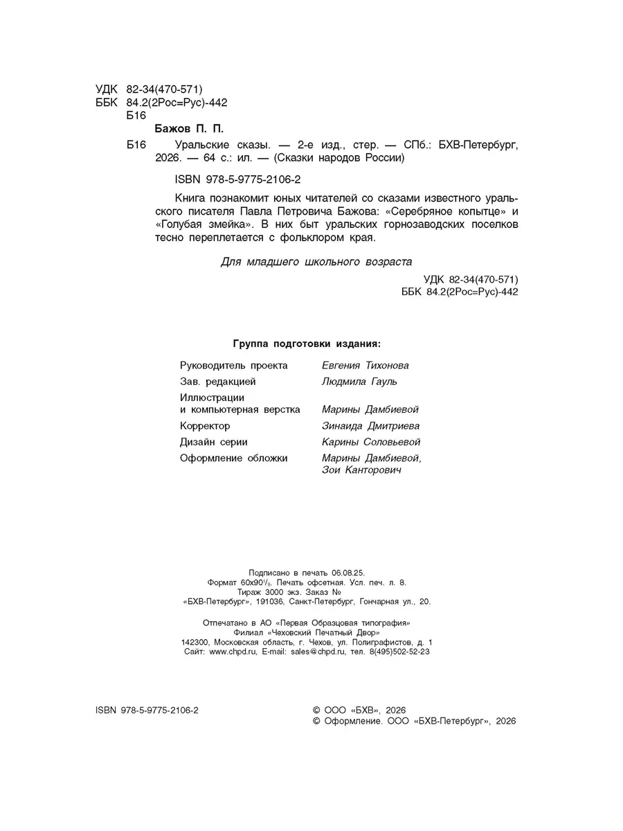 Книга познакомит юных читателей со сказами известного уральского писателя Павла Петровича Бажова: "Серебряное копытце" и "Голубая змейка". В них быт уральских горнозаводских поселков тесно переплетается с фольклором края.
