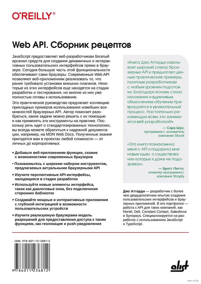Книга посвящена разработке современных веб-приложений с использованием JavaScript и встроенных возможностей браузера на основе Web API. Приведены практические примеры реализации функций, которые ранее требовали сторонних плагинов: диалоговые окна, работа с геолокацией и другими возможностями, предоставляемыми браузером. Освещаются как устоявшиеся, так и находящиеся в стадии разработки API-интерфейсы, позволяющие создавать мощные и интерактивные веб-приложения, глубоко интегрированные с устройствами пользователей. Рассматривается, как браузеры реализуют модель разрешений для предоставления доступа к таким функциям, как геолокация и push-уведомления. Каждая задача в книге сопровождается готовыми рецептами, содержащими описание проблемы, решение с пояснениями и расширенное обсуждение. Книга ориентирована на программистов с опытом работы на JavaScript, знакомых с программным интерфейсом DOM (Document Object Model).