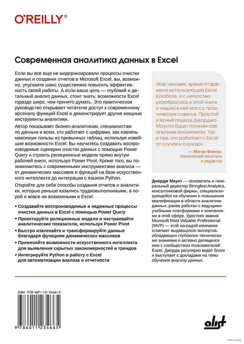 Рассмотрены современные методы очистки, анализа и визуализации данных в Microsoft Excel. Описаны инструменты Power Query для создания воспроизводимых процессов подготовки данных, средства Power Pivot для построения реляционных моделей и настройки аналитических показателей. Приведены практические примеры использования динамических массивов, функций на базе искусственного интеллекта и интеграции с языком Python. Показано, как создавать отчеты и аналитические материалы, ранее считавшиеся трудновыполнимыми в Excel. Книга ориентирована на специалистов по данным, бизнес-аналитиков и пользователей Excel, заинтересованных в расширении своих возможностей.