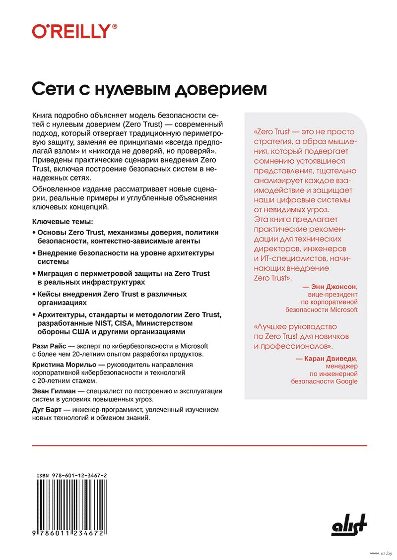 Раскрыта парадигма информационной безопасности сетей с нулевым доверием (Zero Trust), полностью пересматривающая традиционные подходы к защите данных. Изложены фундаментальные принципы, включая непрерывную верификацию, минимальные привилегии и микросегментацию. Приведены практические сценарии внедрения Zero Trust, включая построение безопасных систем в ненадежных сетях. Обсуждены механизмы контроля доступа, системы оценки доверия и современные методы аутентификации. Приведены конкретные примеры интеграции решений для защиты устройств, пользователей и сетевого трафика. Освещены вопросы миграции с устаревших периметровых систем на архитектуру Zero Trust и рассмотрены реальные кейсы внедрения в организациях различного масштаба. Описаны фреймворки Zero Trust, архитектуры, стандарты и методологии Zero Trust, разработанные NIST, CISA, Министерством обороны США и другими организациями. Дан анализ влияния новых технологий, таких как искусственный интеллект и квантовые вычисления, на эволюцию модели безопасности.