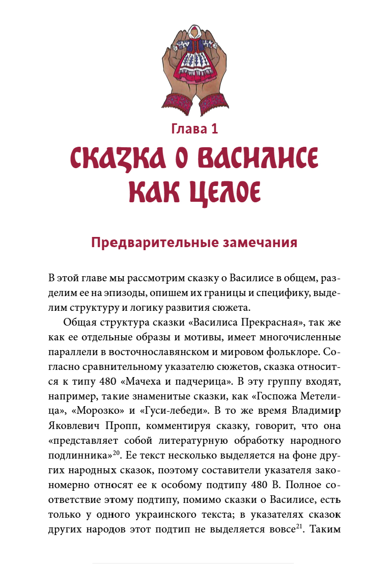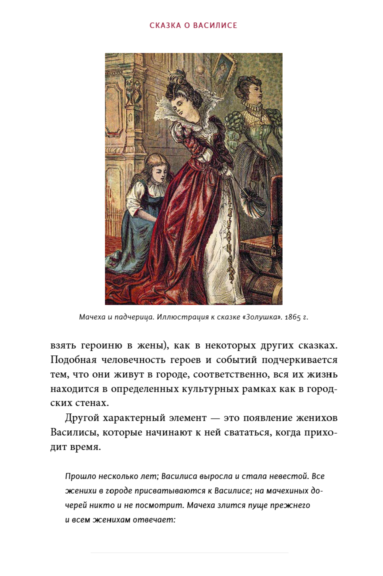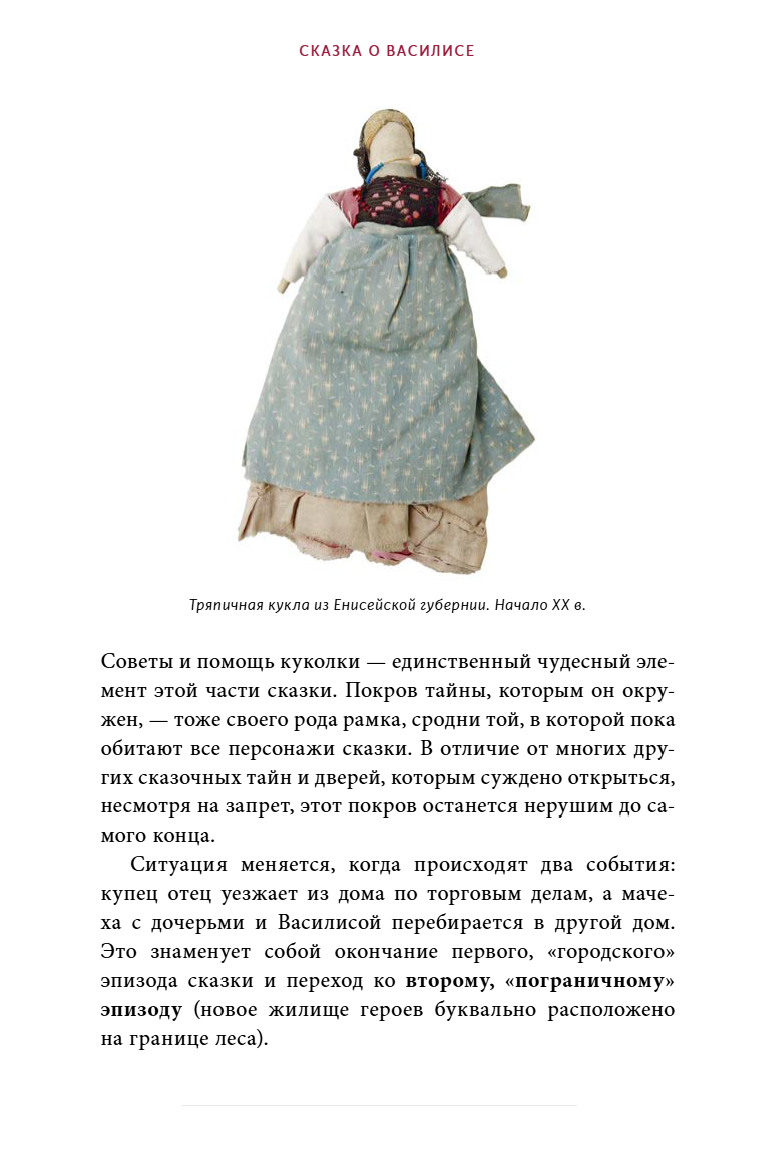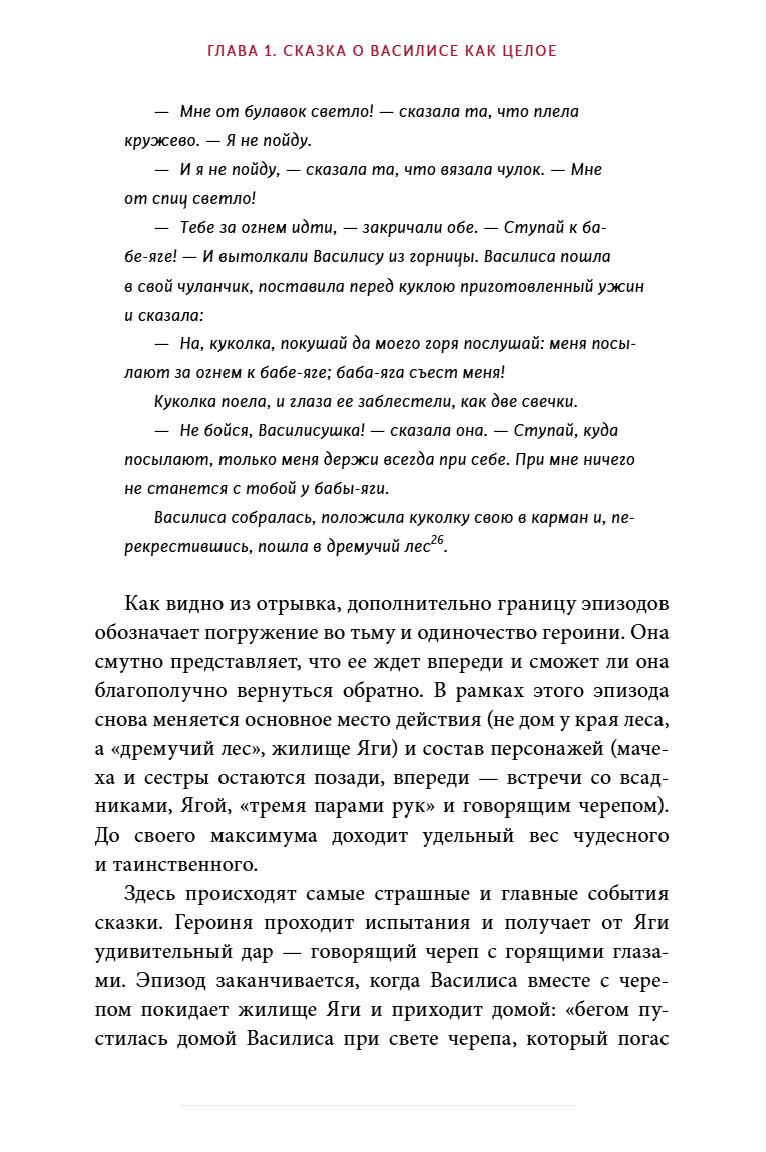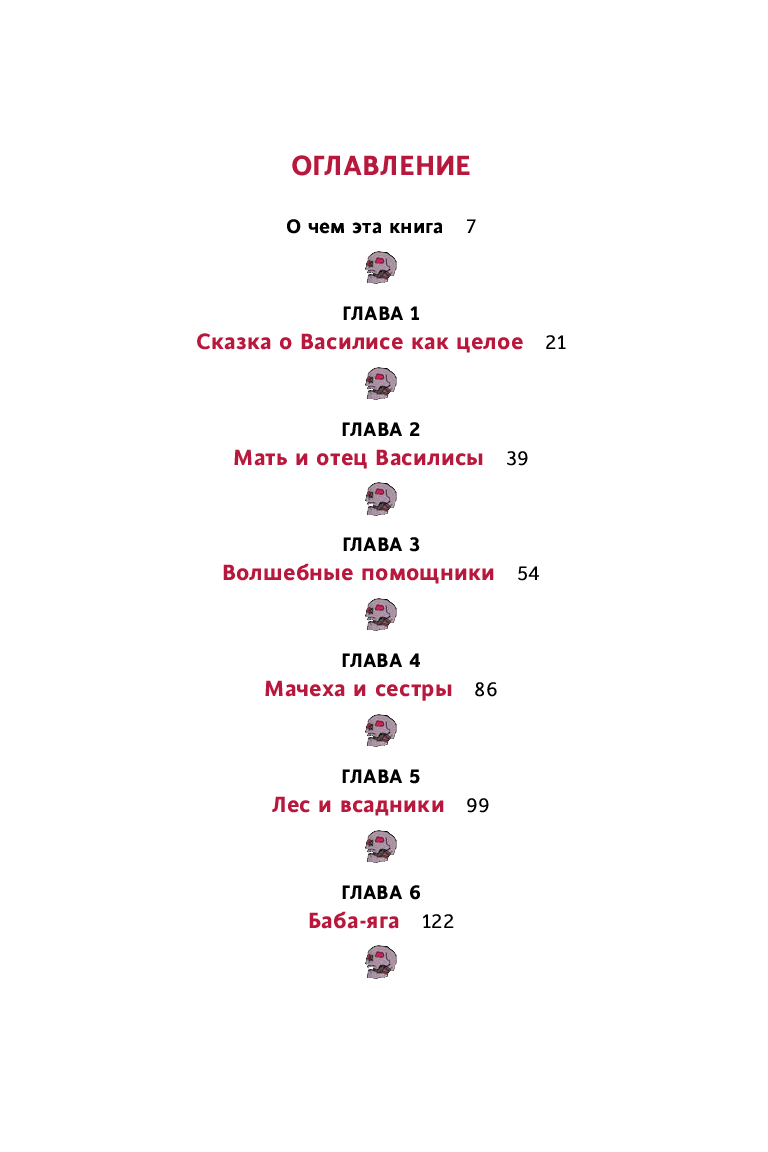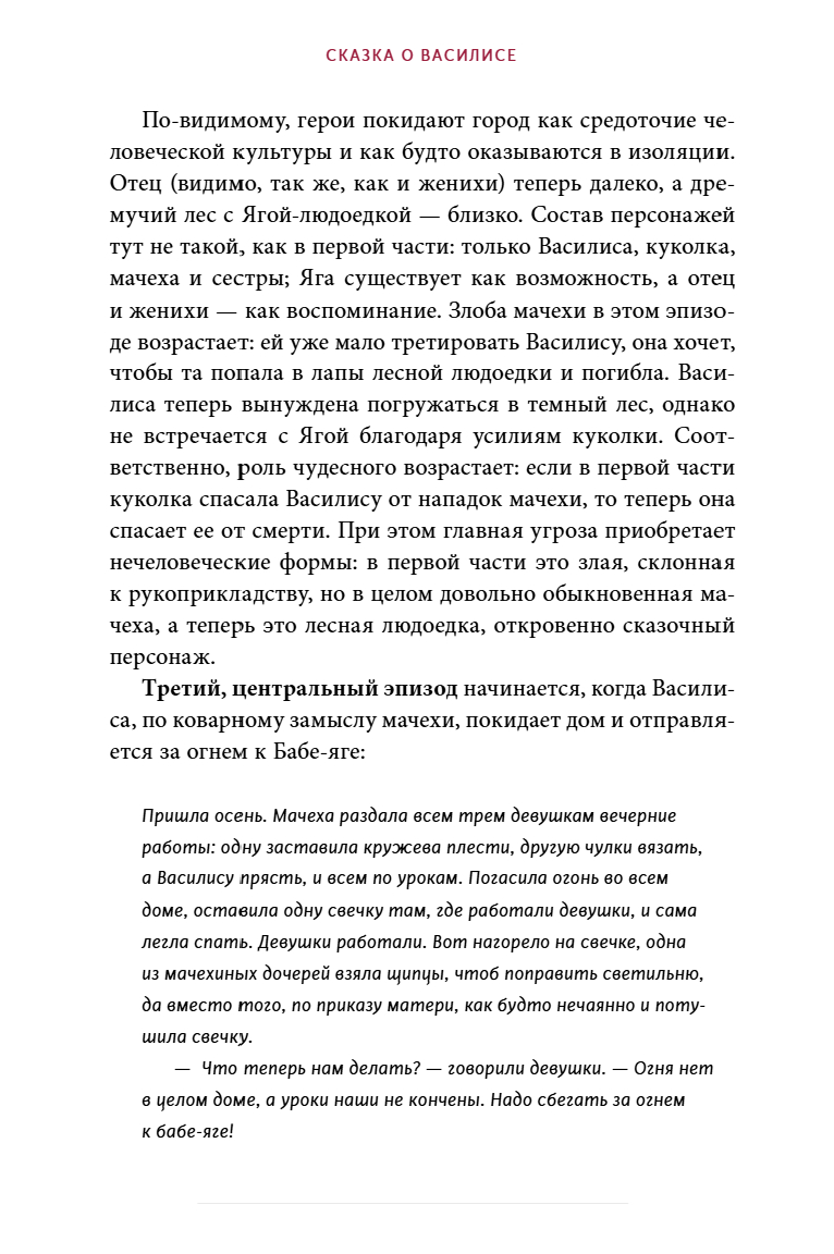 В этой книге путешествие Василисы исследуется с двух точек зрения. Во-первых, согласно теории В. Я. Проппа, с многочисленными параллелями в фольклоре и народных обычаях. Во-вторых, с точки зрения юнгианской психологии и теории архетипов: смерть "хорошей матери", встречи в темном лесу, испытания Яги, уважение к Тайне, освобождение от власти Тени. В этом контексте сюжет и образы сказки оказываются отражением процессов, происходящих в человеческой психике.