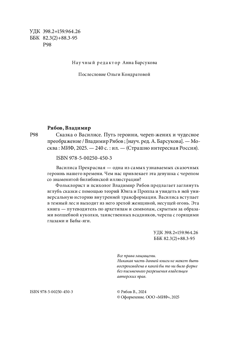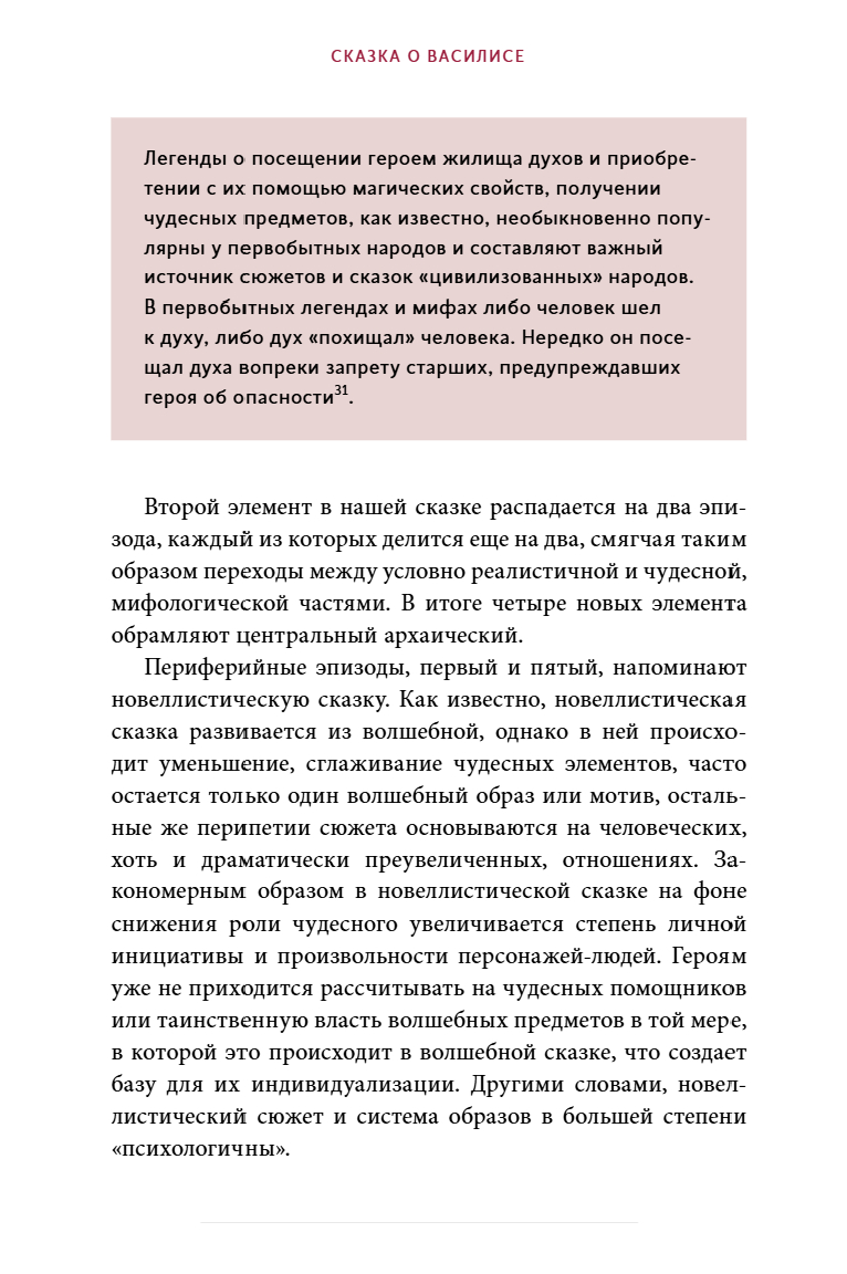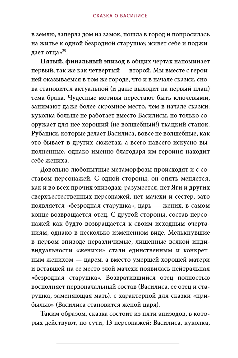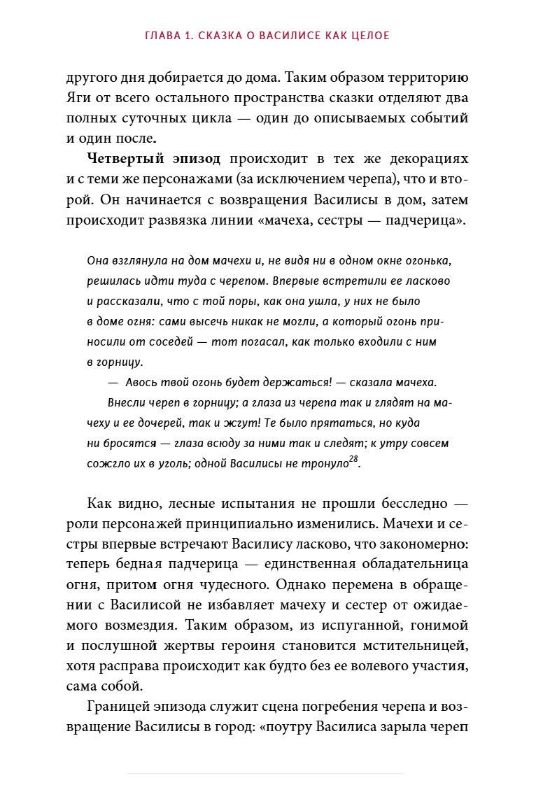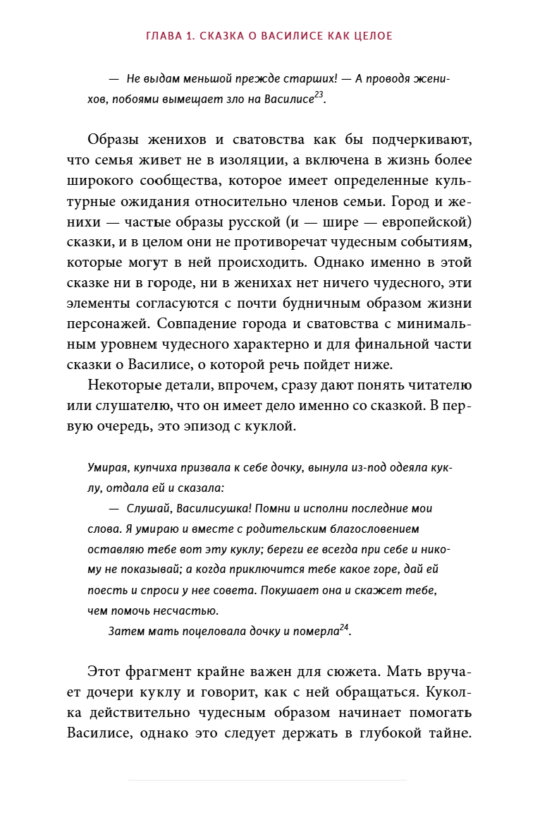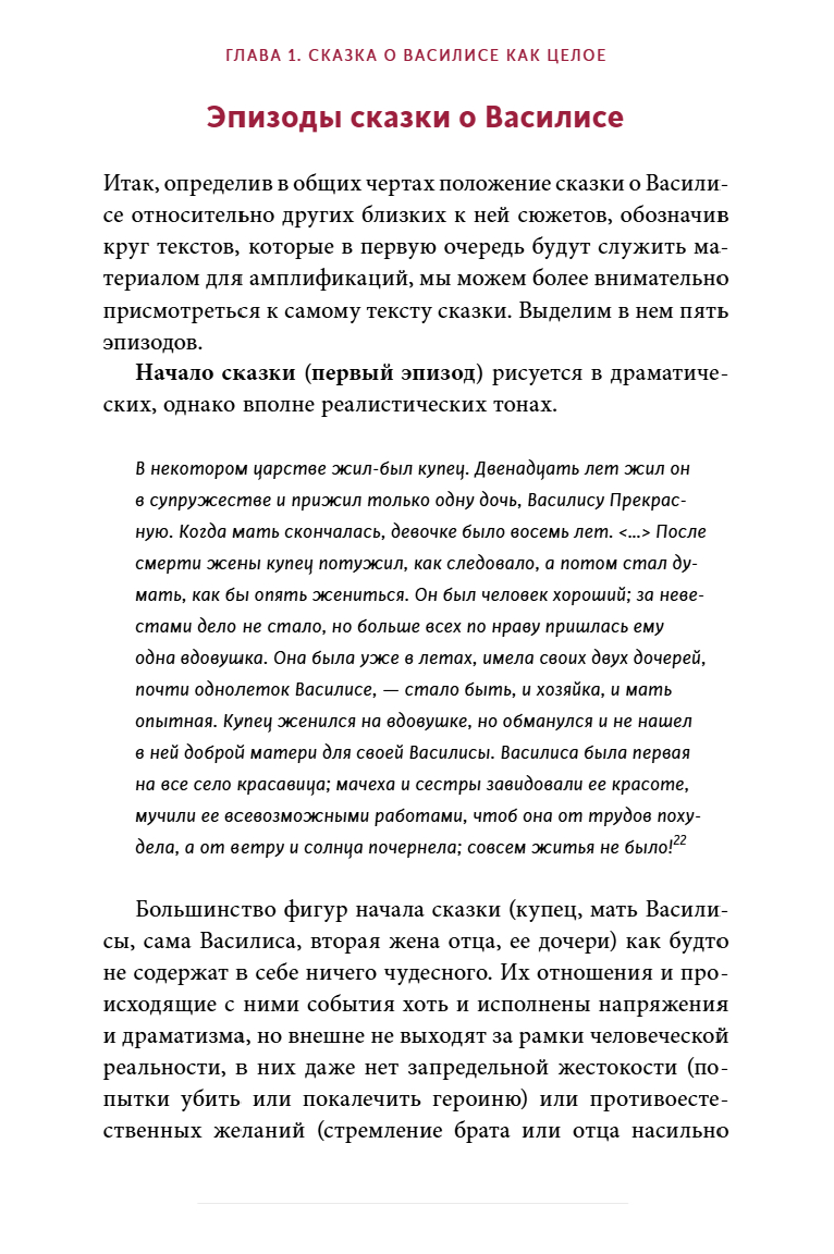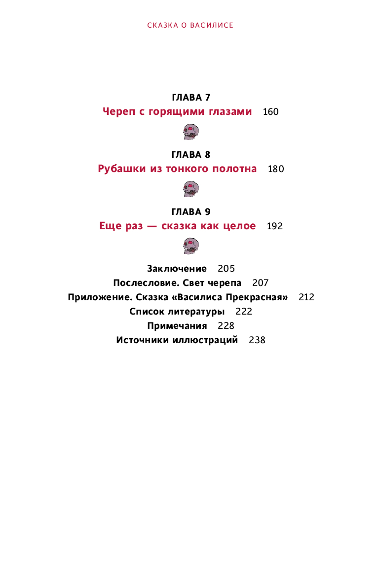 В этой книге путешествие Василисы исследуется с двух точек зрения. Во-первых, согласно теории В. Я. Проппа, с многочисленными параллелями в фольклоре и народных обычаях. Во-вторых, с точки зрения юнгианской психологии и теории архетипов: смерть "хорошей матери", встречи в темном лесу, испытания Яги, уважение к Тайне, освобождение от власти Тени. В этом контексте сюжет и образы сказки оказываются отражением процессов, происходящих в человеческой психике.