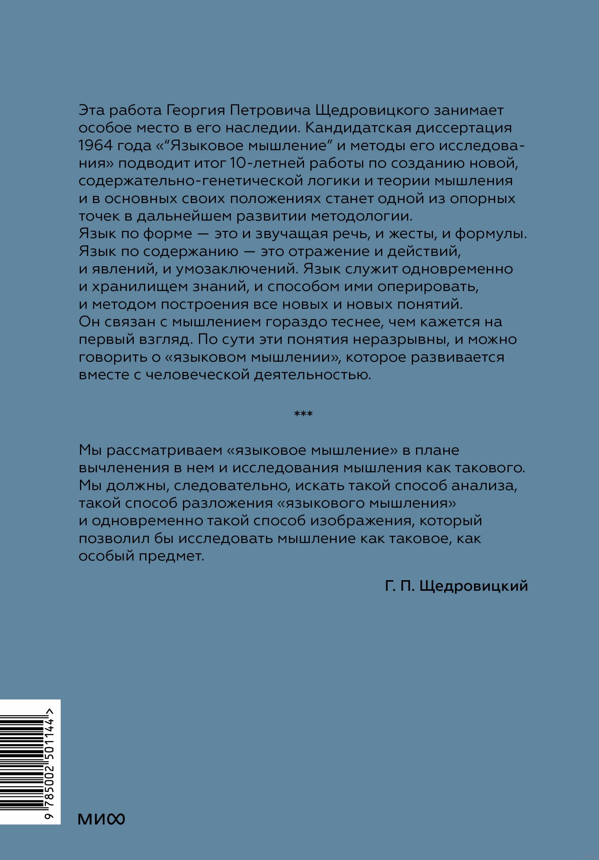 Эта работа Георгия Петровича Щедровицкого занимает особое место в его наследии. Кандидатская диссертация 1964 года ""Языковое мышление" и методы его исследования" подводит итог 10-летних исследований по новой, содержательно-генетической логике и теории мышления и в основных своих положениях станет одной из опорных точек в дальнейшем развитии методологии.