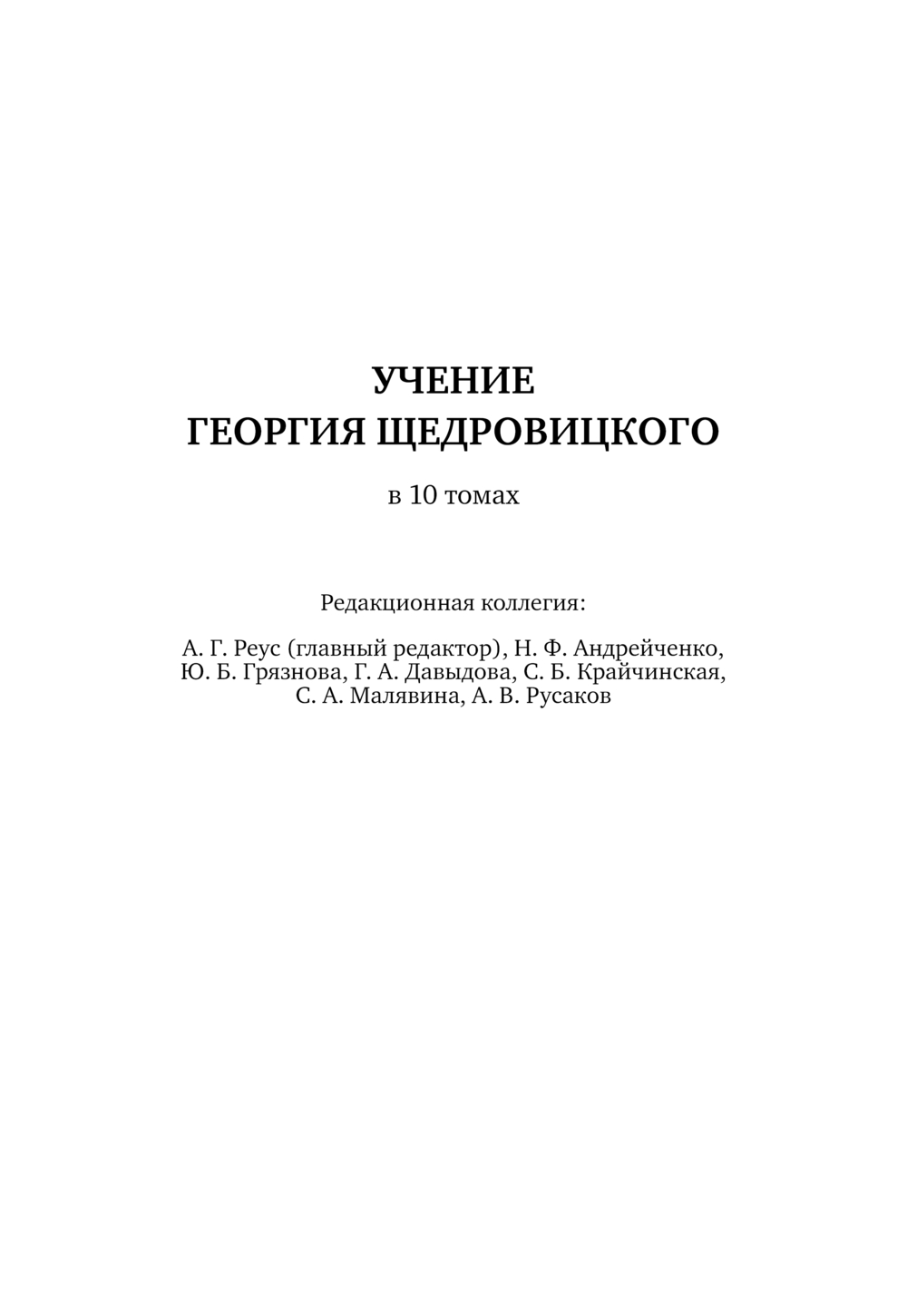 Книга входит в многотомное издание "Учение Георгия Щедровицкого". Редакционная коллегия серии: А. Г. Реус (главный редактор), Н. Ф. Андрейченко, Ю. Б. Грязнова, Г. А. Давыдова, С. Б. Крайчинская, С. А. Малявина, А. В. Русаков.