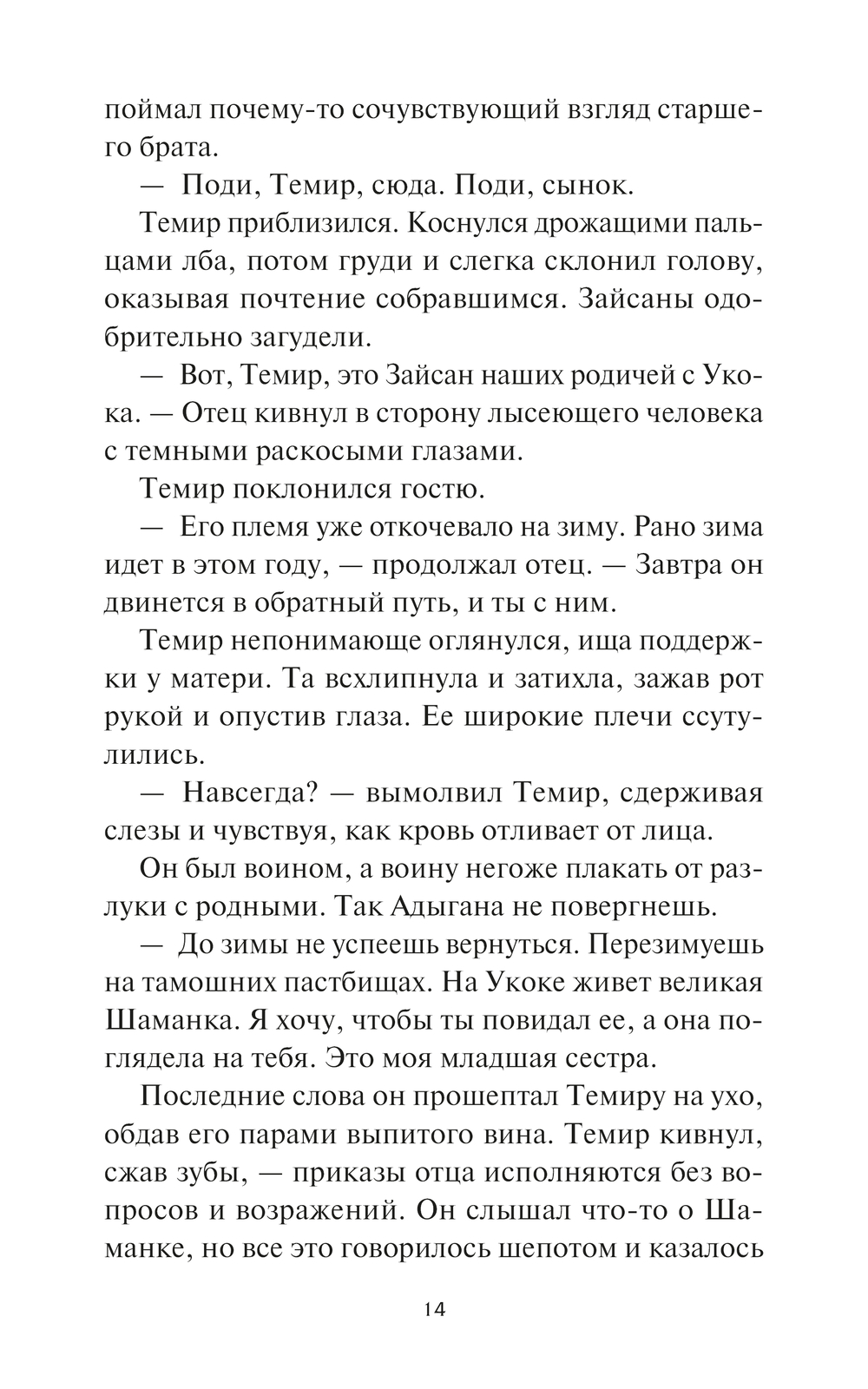 Над заснеженными вершинами, строптивыми реками, опасными перевалами и бескрайними лесами летит песня об отважных кочевниках, мудрых шаманах, справедливом Духе Тайги, таинственных слезах солнца и людях со звезд.