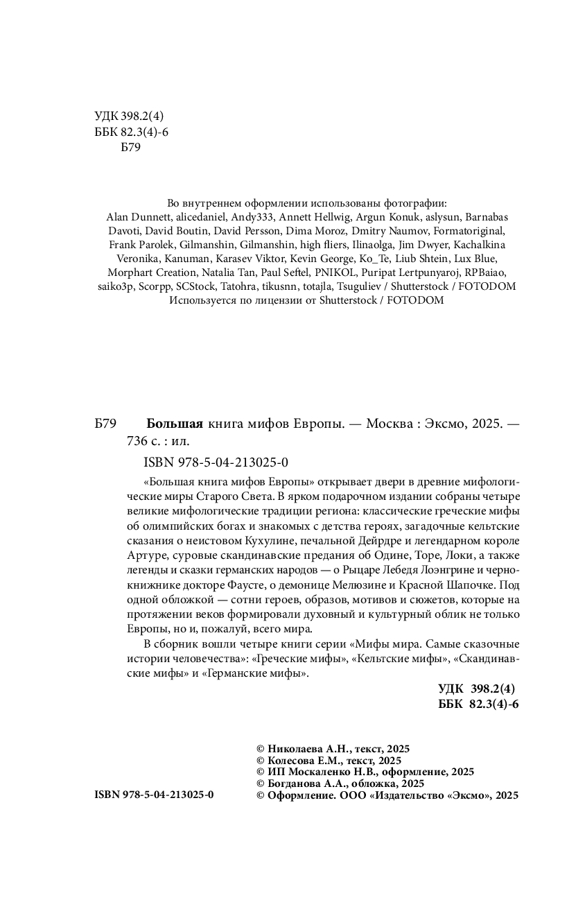 "Большая книга мифов Европы" открывает двери в древние мифологические миры Старого Света. В ярком подарочном издании собраны четыре великие мифологические традиции региона: классические греческие мифы об олимпийских богах и знакомых с детства героях, загадочные кельтские сказания о неистовом Кухулине, печальной Дейрдре и легендарном короле Артуре, суровые скандинавские предания об Одине, Торе, Локи, а также легенды и сказки германских народов – о Рыцаре Лебедя Лоэнгрине и чернокнижнике докторе Фаусте, о демонице Мелюзине и Красной Шапочке. Под одной обложкой – сотни героев, образов, мотивов и сюжетов, которые на протяжении веков формировали духовный и культурный облик не только Европы, но и, пожалуй, всего мира.