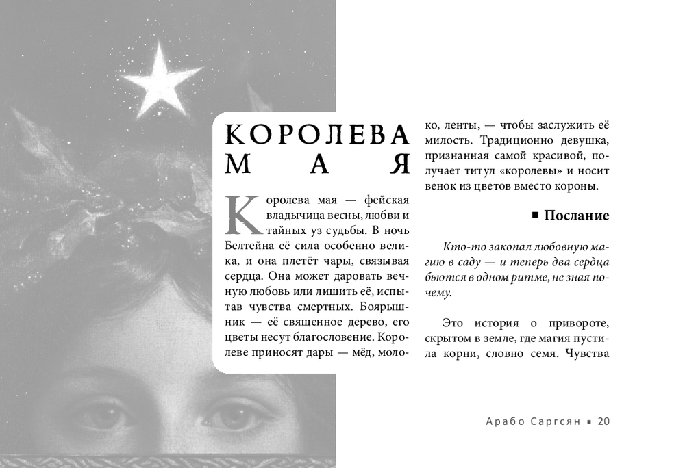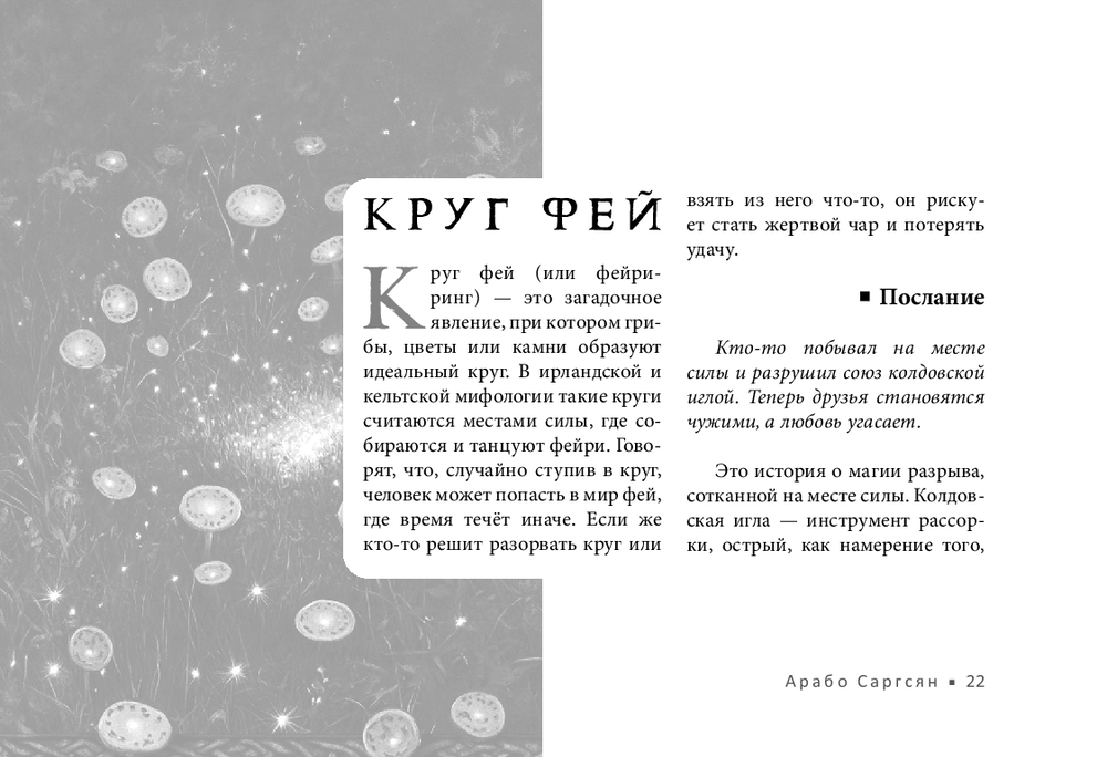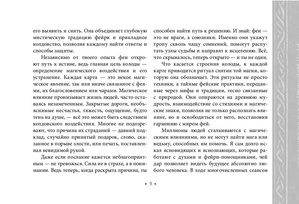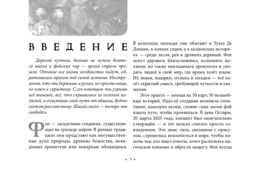 Он был создан как навигатор по миру фейри – месту, где переплетаются мифы, магия и архетипы. Внутри колоды собраны ключевые фигуры и образы фейской традиции (Король фей, Дикая Охота, подменыш, угощение фей и др.). Освещаются темы фейской крови, магических печатей, скрытых порталов и следов, которые фейри могут оставить на судьбе человека. Каждая карта – это послание.