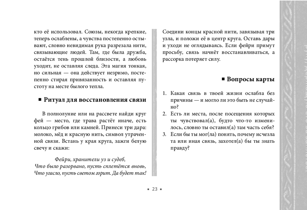 Никогда не поздно изменить свою судьбу, ведь будущее не бывает окончательно определено. И феи как никто другой способны помочь в этом. Их магия изменений и трансформации проявляет скрытые пути, помогает выйти из замкнутого круга проблем и увидеть то, что долго оставалось вне поля зрения. С этой колодой вы сможете распутывать старые узлы, очищать энергетику и личное пространство и – главное – находить новые благоприятные дороги.