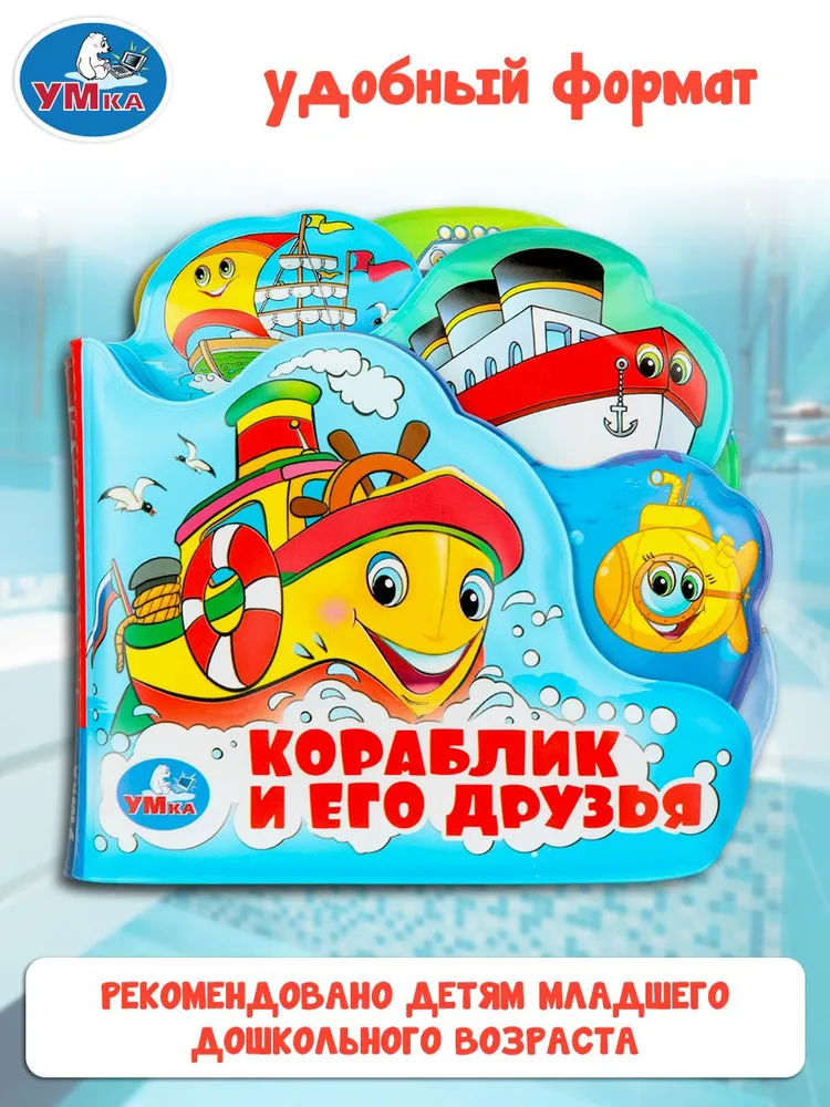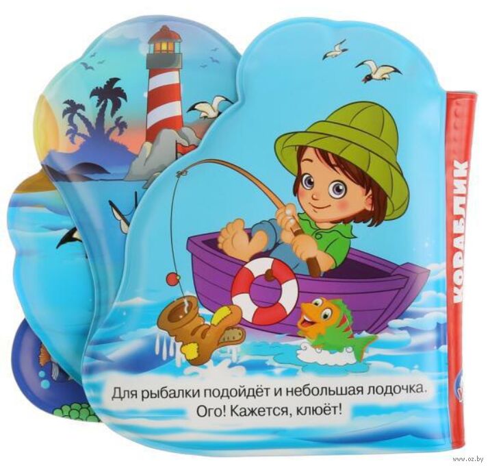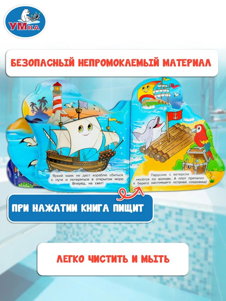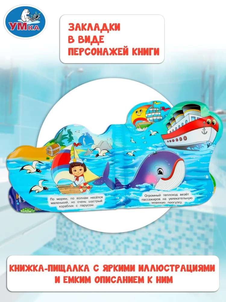 Книга для ванны с красочными картинками и пищащими страницами непременно понравится малышу. Благодаря этой книге ребёнок познакомится с подводным миром и видами водного транспорта.