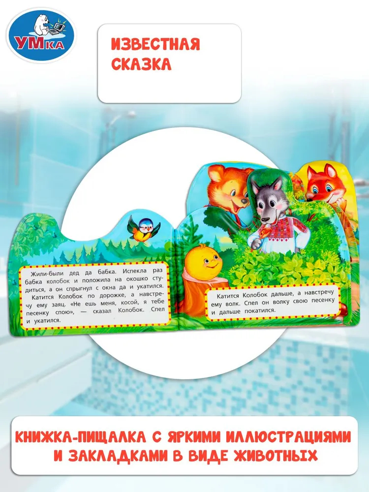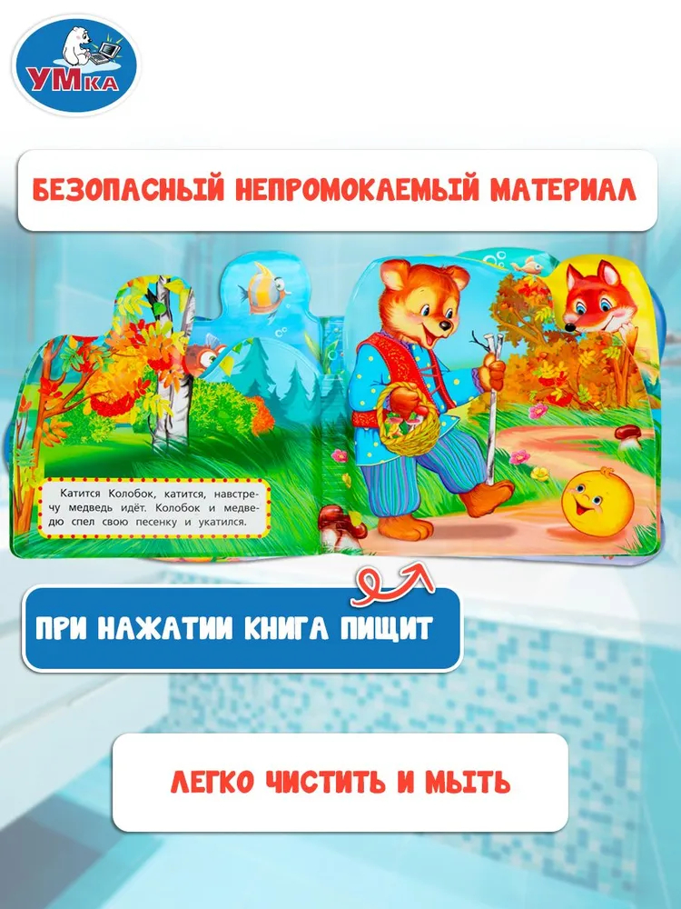 Книга с красочными изображениями персонажей известной русской народной сказки обязательно заинтересует малыша. Кроме того, она сможет развеселить маленького непоседу тем, что при нажатии на страницу издаёт забавный пищащий звук. С такой игрушкой ребёнку будет весело и интересно принимать ванну, а также её можно использовать во время кормления или прогулок: непромокаемый материал легко моется.