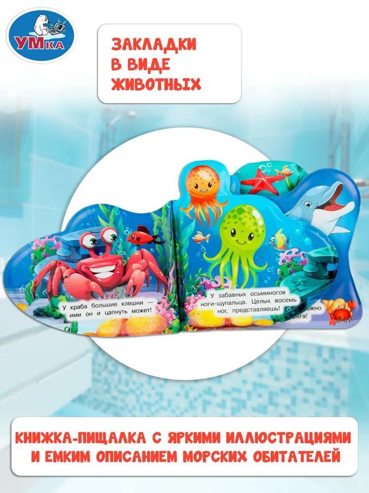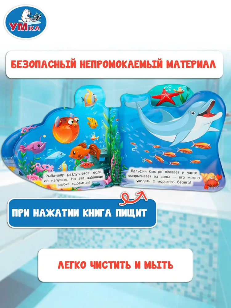 Книга с красочными изображениями морских обитателей заинтересует малыша. Книжка-игрушка изготовлена из непромокаемого материала. Вместе с такой книгой ребёнку будет весело и интересно играть и принимать ванную. Если нажать на страничку, она запищит, чем развеселит малыша. Благодаря компактным размерам игрушку удобно брать с собой на прогулку и в поездки.
