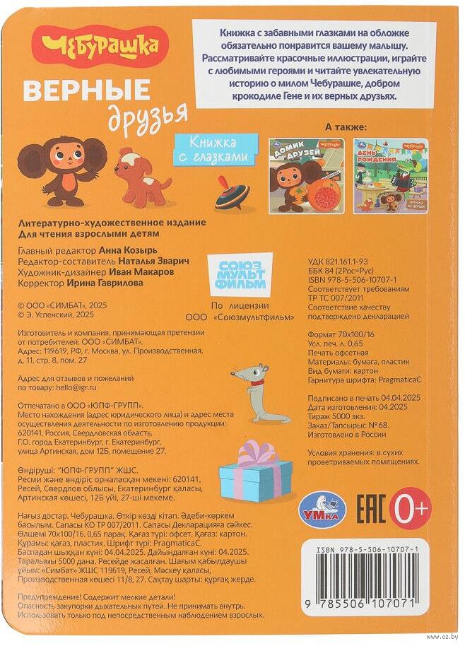 Книжка с глазками "Союзмультфильм. Верные друзья" непременно понравится малышу. На страницах этой яркой книги ребёнка ждёт встреча с любимыми мультгероями. Увлекательная история сопровождается большими красочными картинками с подвижными глазками, благодаря которым персонажи выглядят совсем как живые. Компактный размер книги позволяет взять её с собой в путешествие.