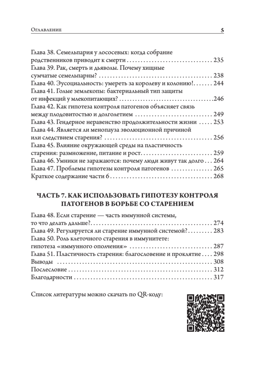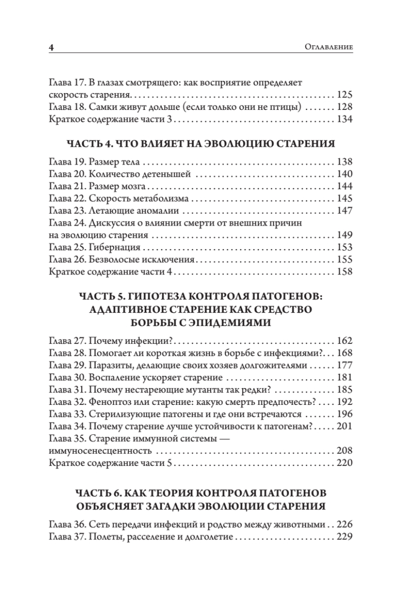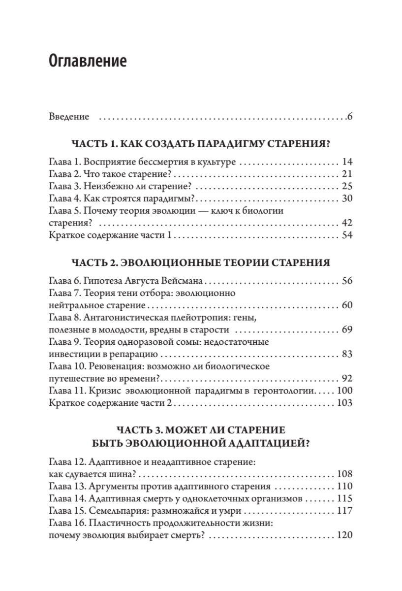 Таким образом, старение является частью иммунной системы, которая защищает не саму особь, а ее родственников. Большая часть книги посвящена обсуждению феноменов, не объясненных классическими теориями старения.