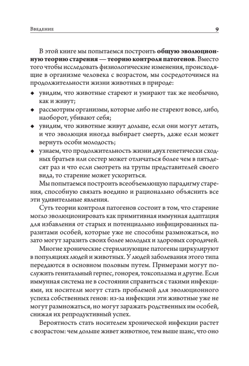 Теория контроля патогенов, описанная в этой книге, бросает вызов устоявшимся догмам. Согласно этой теории, старение – результат работы генетической программы, эволюционировавшей чтобы убивать старые организмы. Зачем? Старые организмы могут с большей вероятностью оказаться носителями хронических инфекционных заболеваний, которыми они могут заразить своих сородичей.