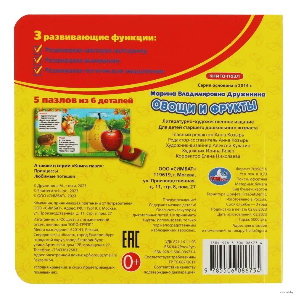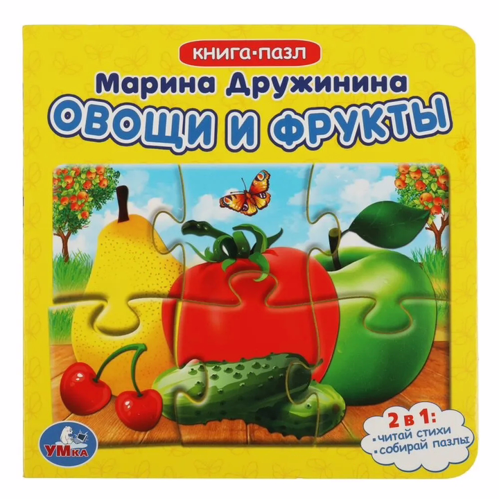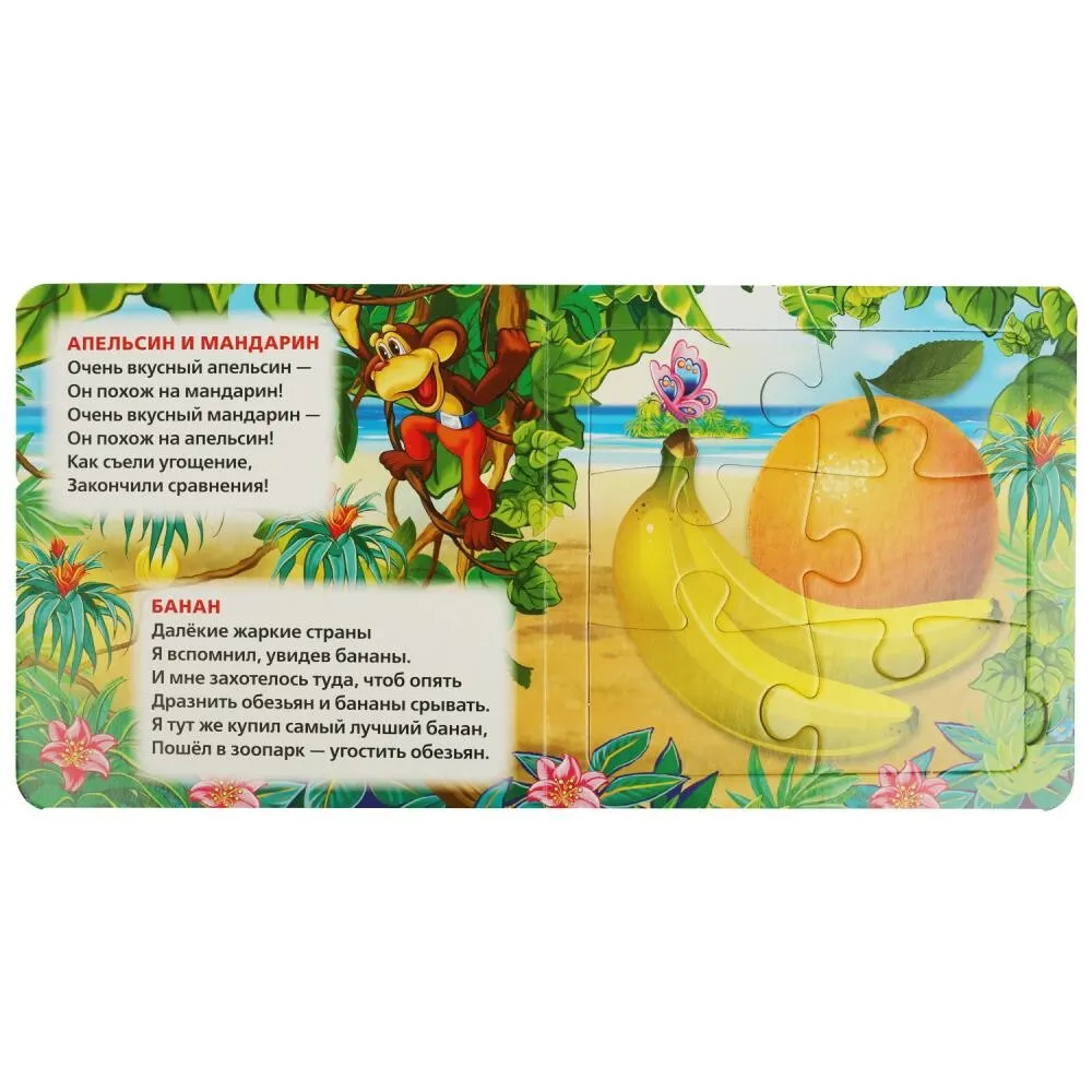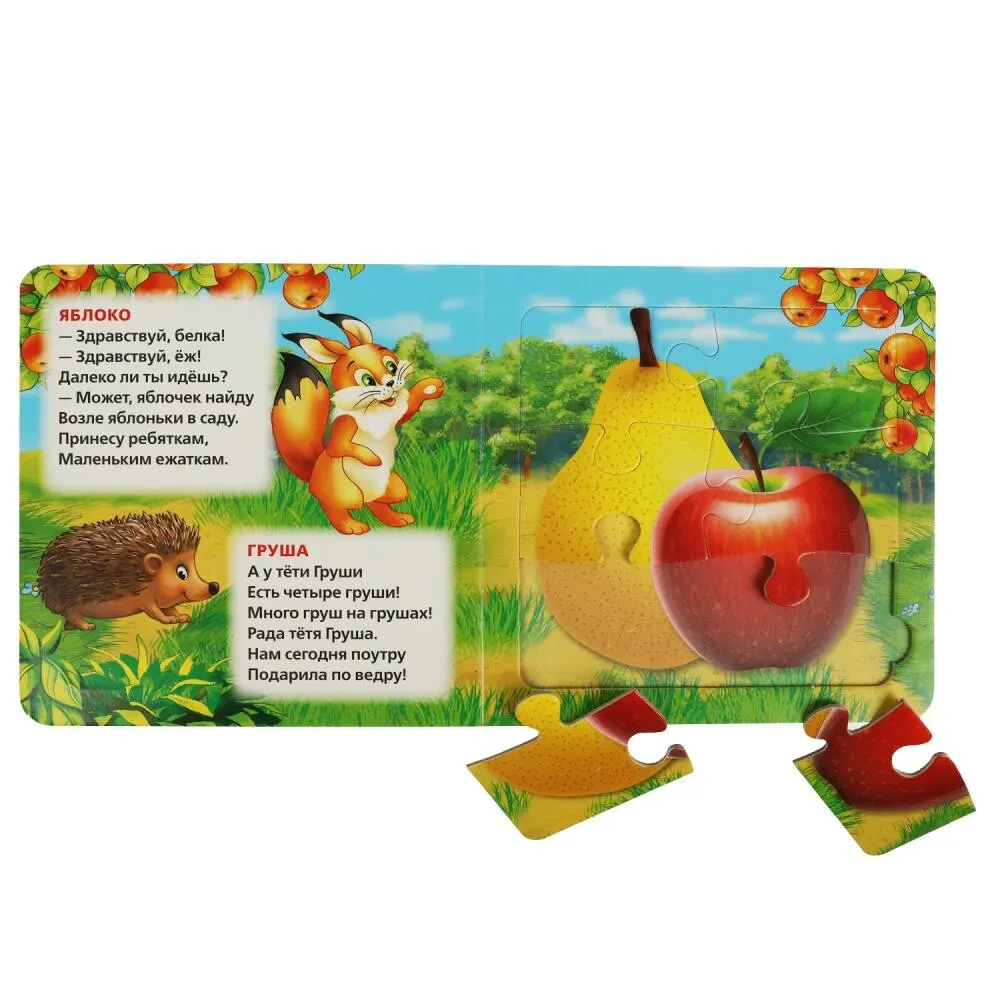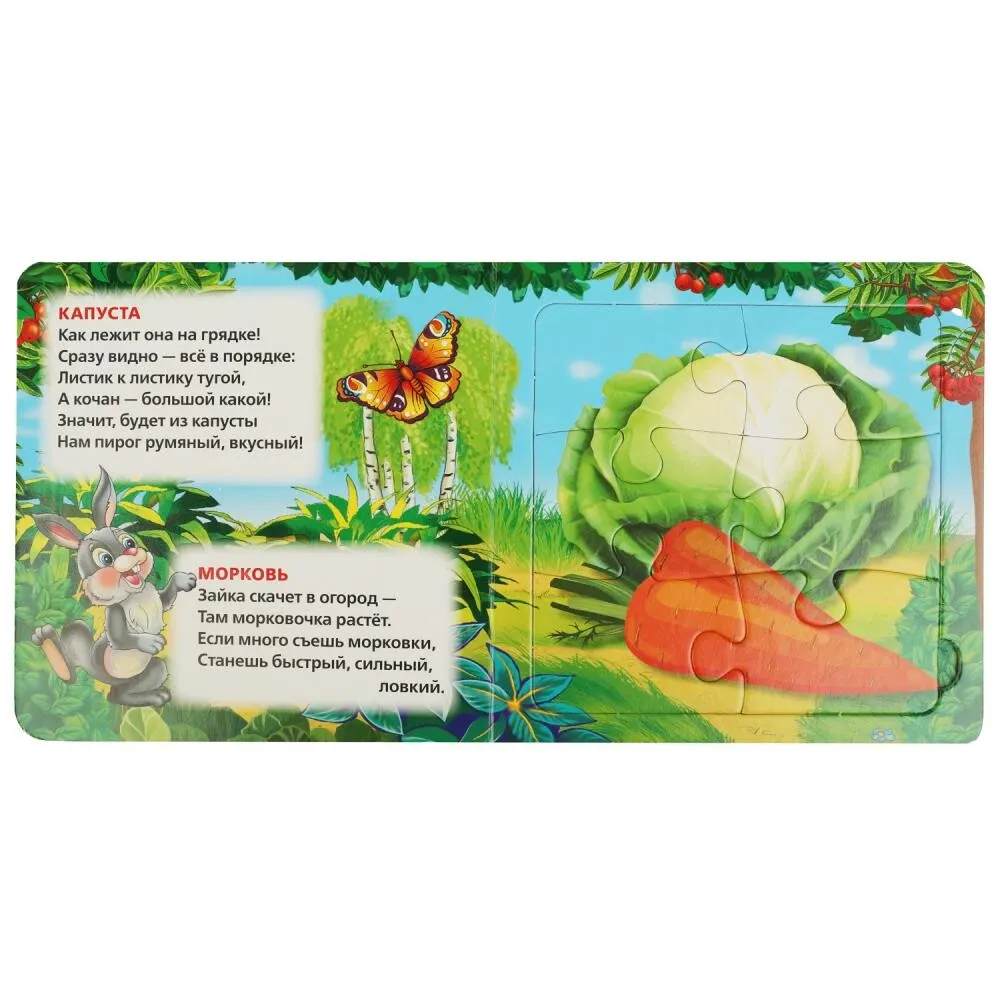 Данная книга выполняет сразу 2 функции: это и книга для чтения, и игра в пазлы. На каждом развороте малыша ждет интересный стих Марины Дружининой, а также яркий пазл с изображением фруктов, ягод или овощей. Книжка изготовлена из плотного картона, поэтому мамы могут не опасаться, что ребенок порвет странички. Благодаря удобному формату книгу можно взять с собой в дорогу.