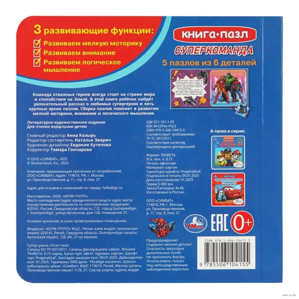 Данная книга выполняет сразу 2 функции: это и книга для чтения, и игра в пазлы. На каждом развороте ребенка ждет интересное повествование, а также яркий пазл из 6 деталей с изображением любимых супергероев. Книжка изготовлена из плотного картона, поэтому мамы могут не опасаться, что ребенок порвет странички. Благодаря удобному формату книгу можно взять с собой в дорогу.