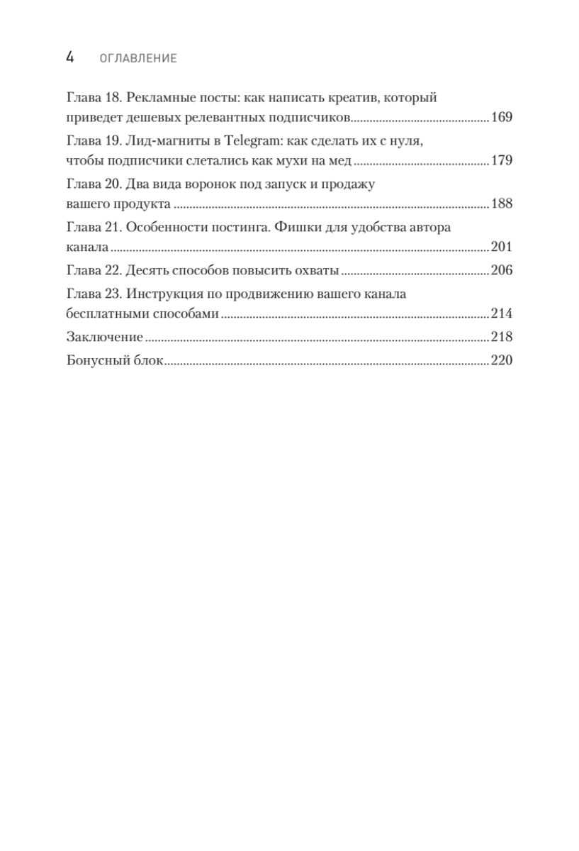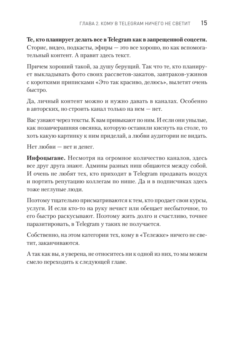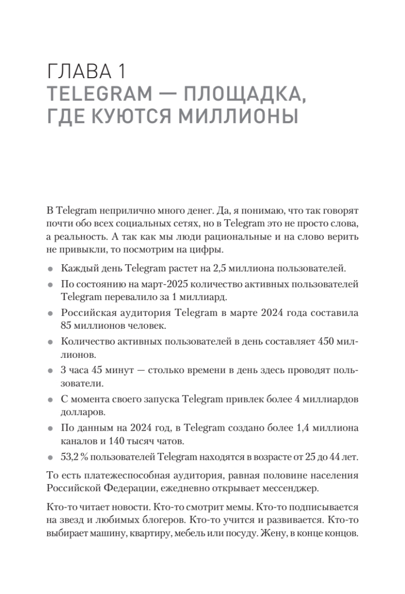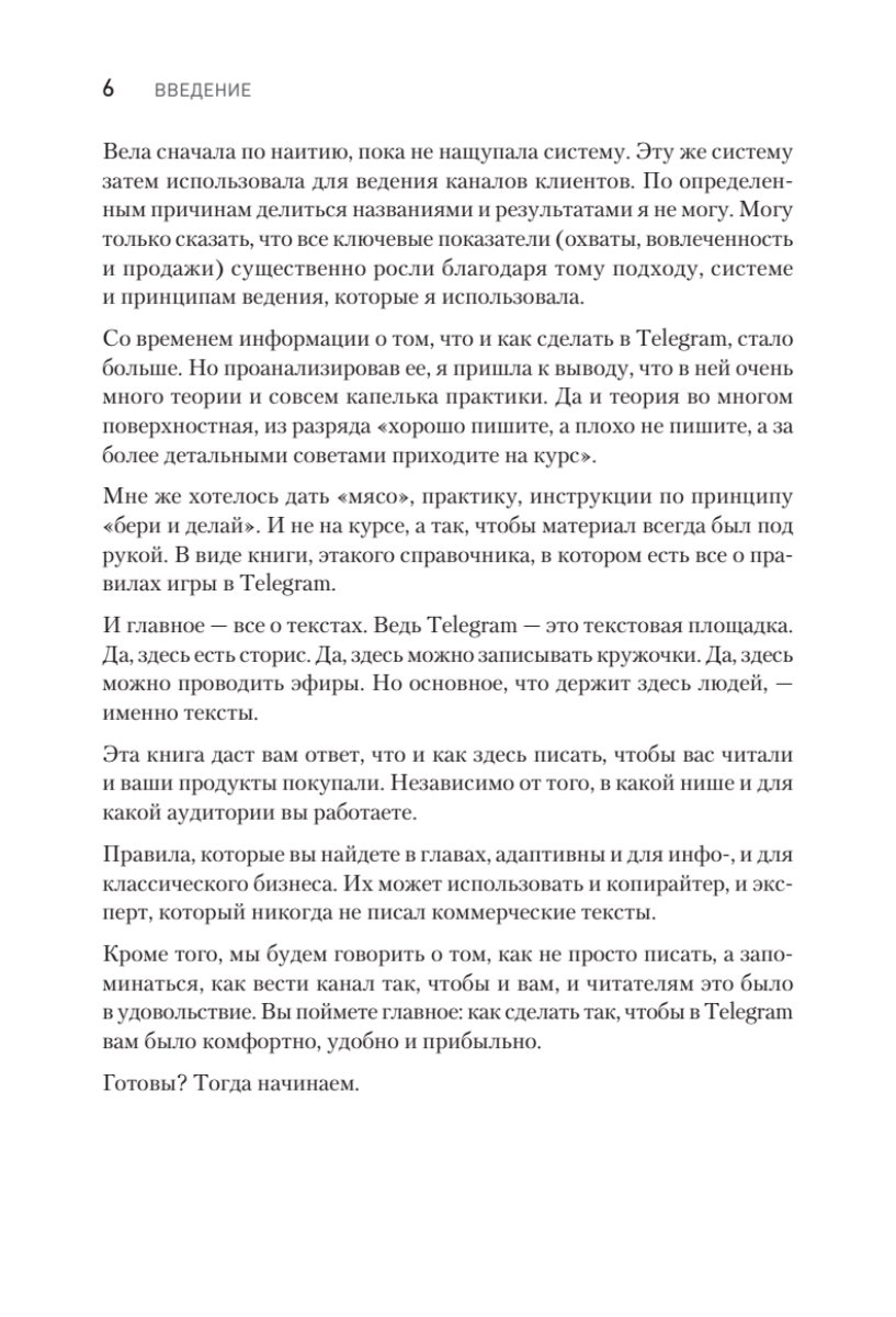 Книга наполнена примерами, формулами и структурами, чтобы каждый, кто до этого даже не вел свой канал в Telegram, мог взять и применить их на практике. Все материалы основываются на личном опыте контент-маркетолога, работающего с ТОПовыми агентствами по трафику в Telegram и онлайн-школами.