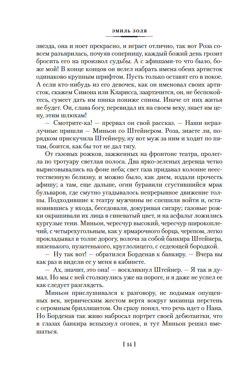 Впервые Нана, героиня одноименного романа (1880), еще совсем малышкой встретилась читателям романа "Западня" (1877). Прошли годы, и эта девочка превратилась в пышную белокурую красавицу, воплотившую в себе эталон торжествующей женственности конца столетия. Прошлое забыто, и золото рекой течет сквозь пальцы порочной дочери парижских улиц, и сильные мира сего почитают за счастье склониться к ее ногам…